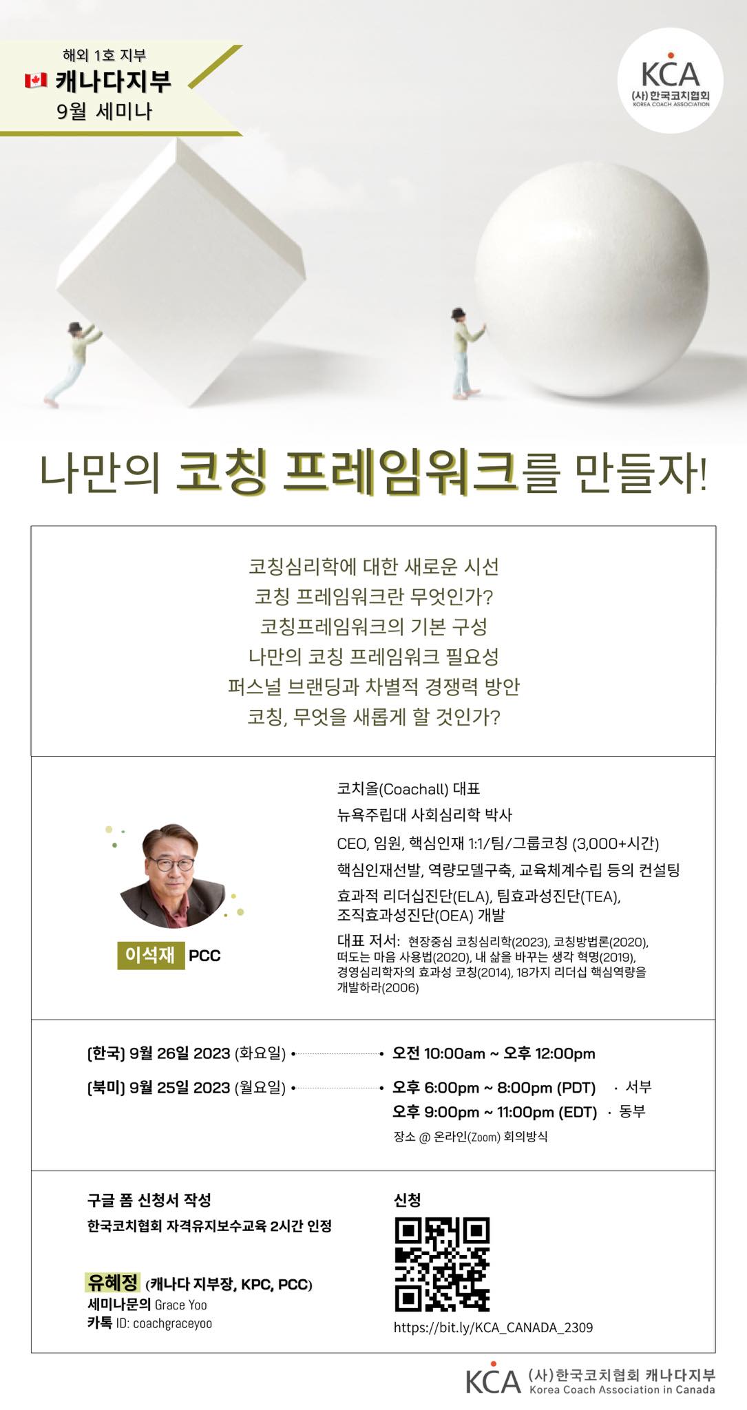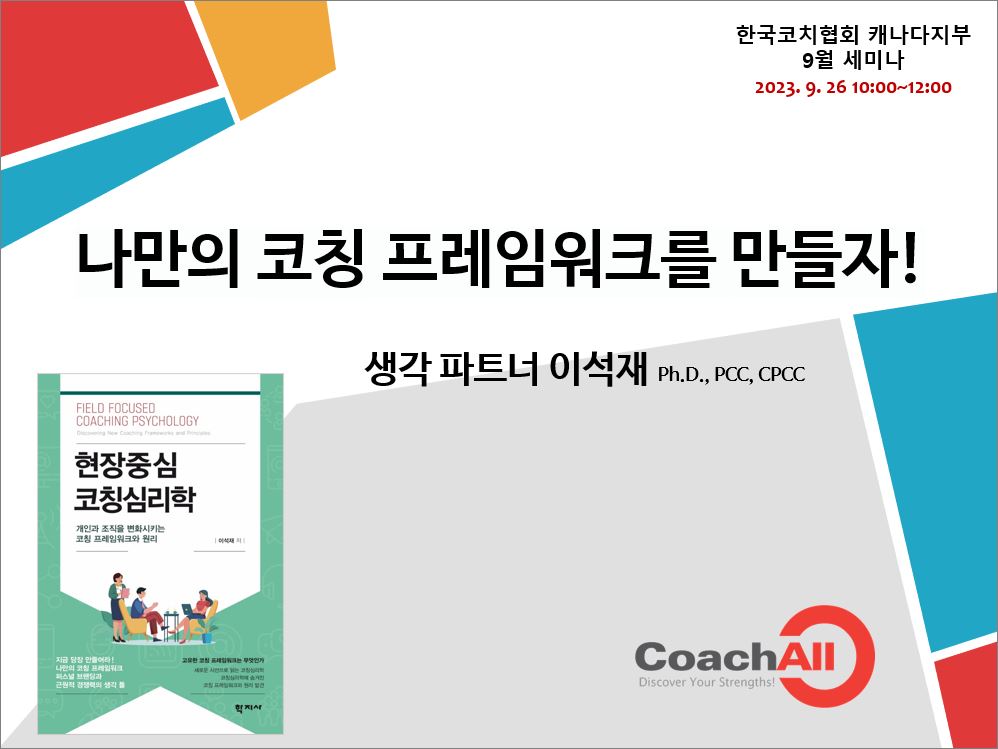 | 9월 세미나: 나만의 코칭 프레임워크를 만들자! (0) | 2023.09.12 |
