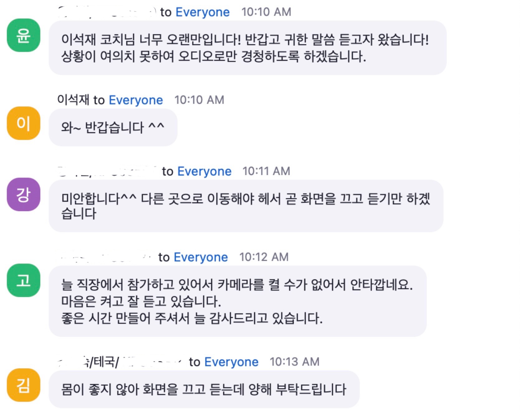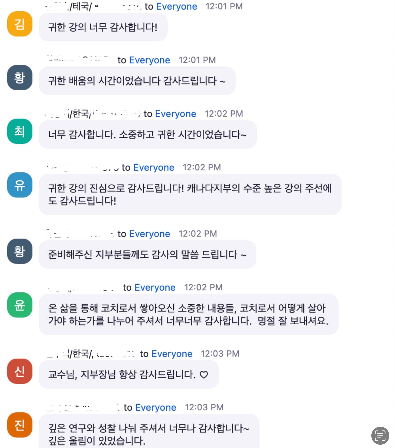 한국코치협회 캐나다지부 9월 세미나에는 캐나다, 한국, 미국, 싱가포르, 태국 등 여러 나라의 코치님들이 참석했습니다. 줌 채팅창에 올라온 일부 질문과 피드백을 기록으로 남김니다. 160명 등록, 130여명 참가
