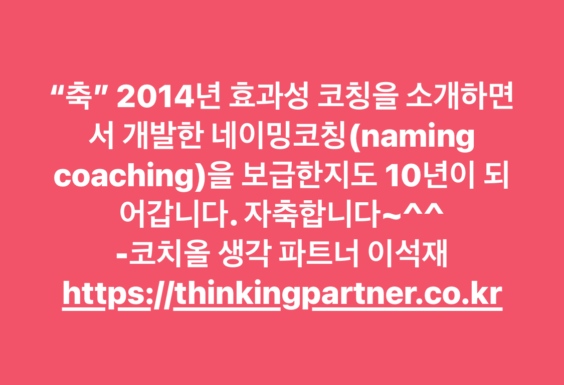 지난 2014년 1월 <경영심리학자의 효과성 코칭> 책의 주요 내용을 '효과성 코칭 워크숍: 개인코칭 & 조직코칭' 과정으로 구성해 일반에 처음 공개했습니다. 이때 생각 파트너가 개발해서 코칭 고객(코칭 대상자)과의 라포 형성을 할 때 주로 사용하는 '네이밍코칭(naming coaching)'을 소개했습니다.