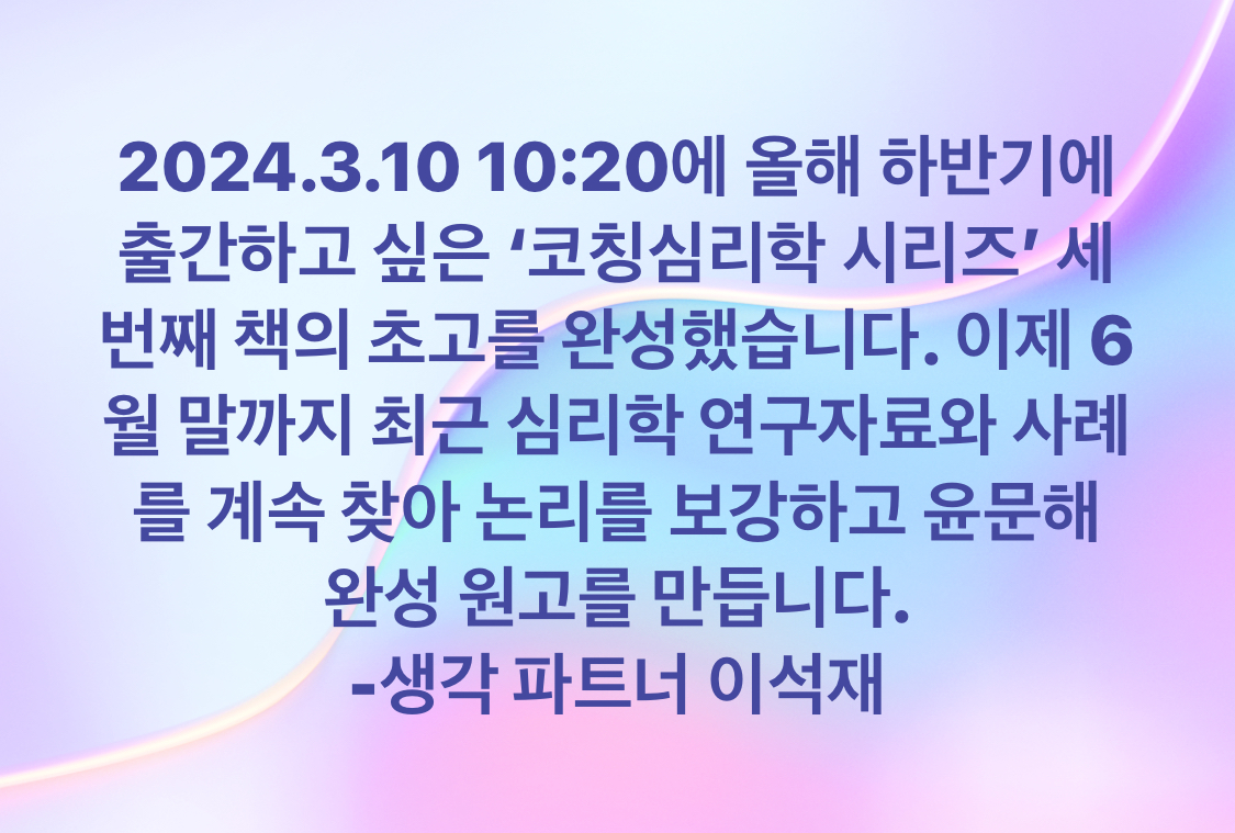 | 코칭심리학 시리즈 쓰기 (0) | 2024.02.28 |