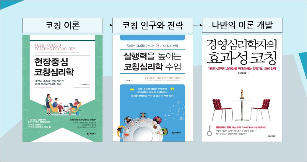 2) 가운데 코칭 연구와 전략에는 '코칭방법론'이 있어야겠죠. <코칭방법론>(이석재, 2020)을 출간했는데 개정이 필요합니다. 그래서 코칭의 주요 개념을 코칭방법론으로 다루는 책으로 <실행력을 높이는 코칭심리학 수업>(이석재, 2024)을 먼저 집필했습니다. 하반기에는 '리더십 코칭심리학'을 출간할 계획입니다.