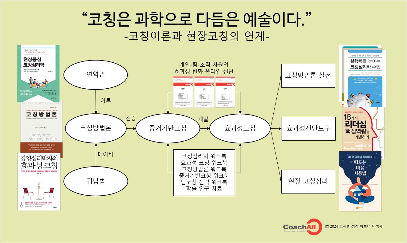 지난 2002년 코칭에 입문한 이후 활동과 기록물을 논리 틀로 정리한 것입니다. 이번에 학지사에서 출간하는 <실행력을 높이는 코칭심리학 수업>(이석재, 2024)은 코칭 체계도 오른쪽 상단에 위치한 것입니다.