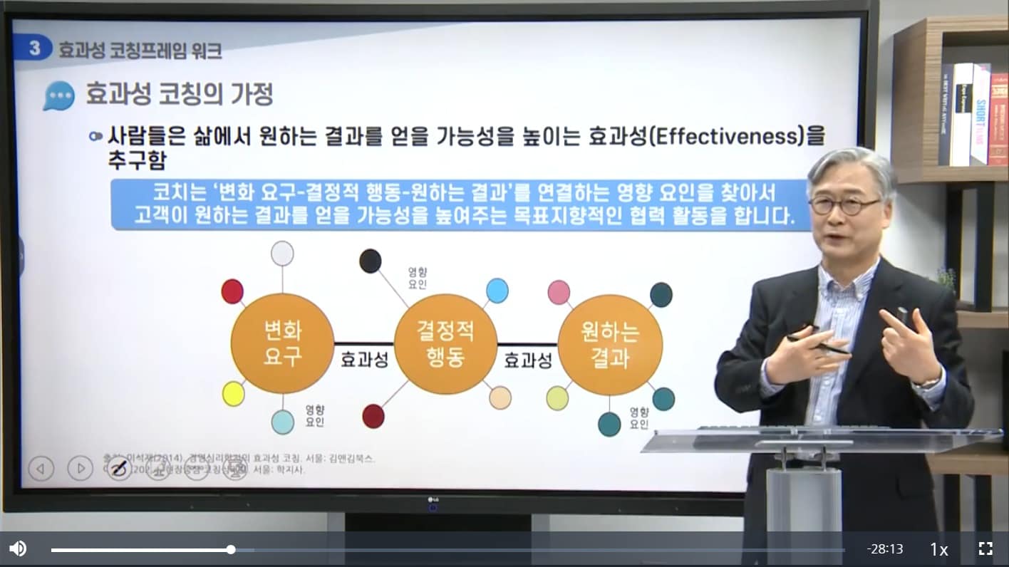 지난 달(20240425) 왕효분 코치님의 도움으로 고려사이버대학에서 ‘현장중심 코칭심리학’을 주제로 한 특강 동영상을 촬영했습니다. 여러 컷을 캡쳐해서 보내주셨네요. 생각 파트너가 개발한 ‘효과성 코칭 이론’을 효과성 프레임워크(effectiveness framework)를 중심으로 설명하고 있네요. 자료를 공유해주셔서 감사합니다. 추억으로 남겨둡니다.