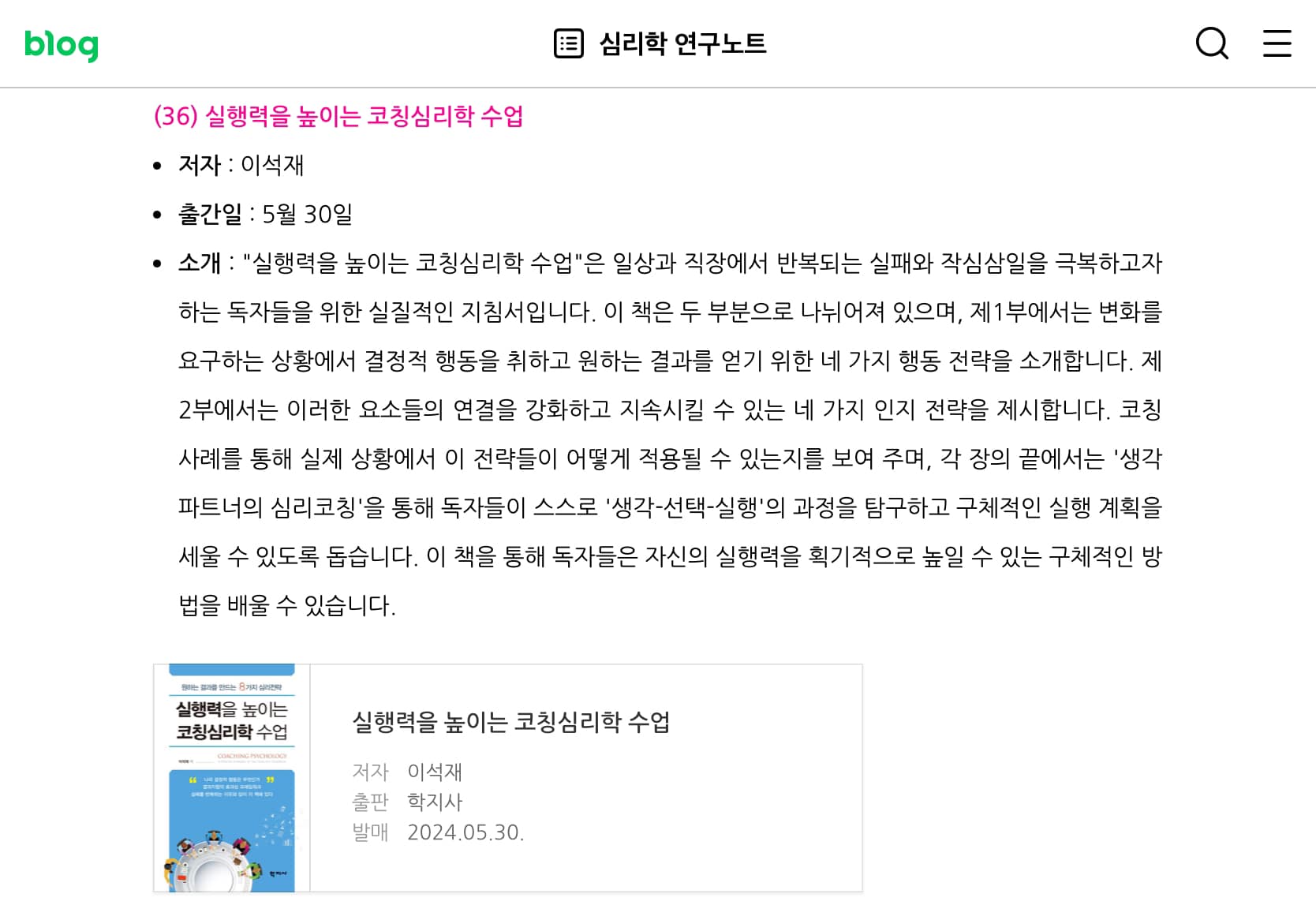 네이버 블로그인 ‘심리학 연구노트’는 매달 출간된 심리학 책을 출간일 순으로 소개합니다. 심리학 책에 관심 있는 분은 방문해 보세요. 5월에 출간된 책 40권을 소개하는데 <실행력을 높이는 코칭심리학 수업> 출간일이 30일이라서 끝쪽에 소개되었네요.