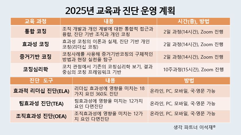 2025년에는 다음 코칭교육과 효과성 진단을 진행합니다.