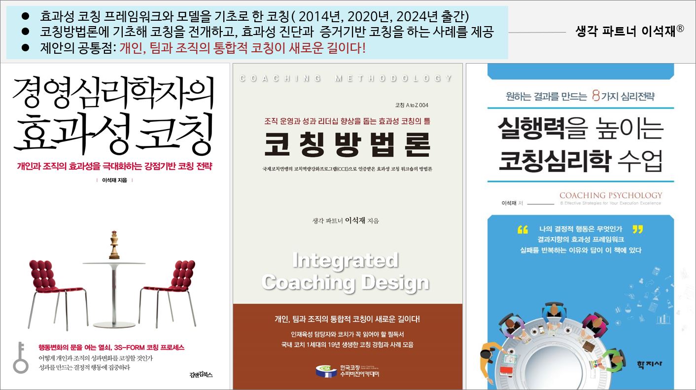 1. 지난 2014년 생각 파트너가 2002년 이후 수행한 개인코칭, 그룹코칭, 팀코칭, 전사코칭(조직코칭), 통합적 코칭사례와 효과성 코칭 방법론을 묶어서 <경영심리학자의 효과성 코칭> 책으로 출간했습니다. 2020년에는 ICF의 30시간 CCE인증을 받은 ‘효과성 코칭 워크숍’의 주요 내용을 <코칭방법론>으로 출간했죠. 2024년에는 효과성 코칭의 개정판에 해당하는 <실행력을 높이는 코칭심리학 수업>을 출간했습니다.