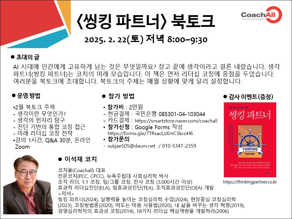 - 코치로서의 삶에 감사 인사로 신간 <씽킹 파트너>(저자 사인)를 증정합니다.
