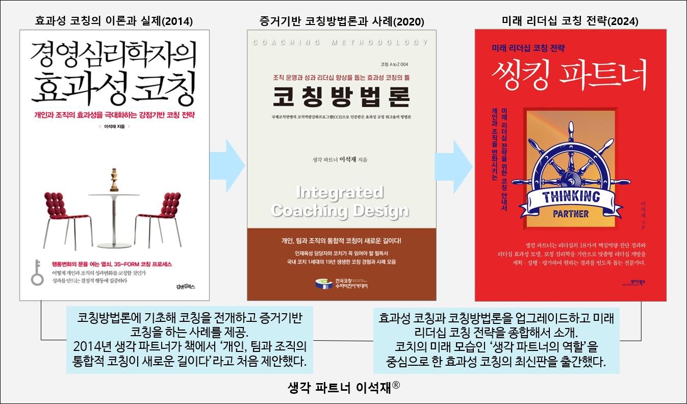 <경영심리학자의 효과성 코칭>(이석재, 2014)을 통해 '개인, 팀과 조직의 통합적 코칭이 새로운 길이다'라고 처음 제안하며 코칭사례를 제시했습니다. 작년에 통합적 코칭을 실천하는 코치와 코칭펌이 가시적으로 나타났죠. 또 앞으로 10년을 내다보며 증거기반으로 통합적 코칭을 실천하는 생각 파트너의 역할과 전략을 <씽킹 파트너>(이석재, 2024)에 담았습니다. 코치(coach)의 미래 모습은 생각 파트너(thinking partner)입니다.