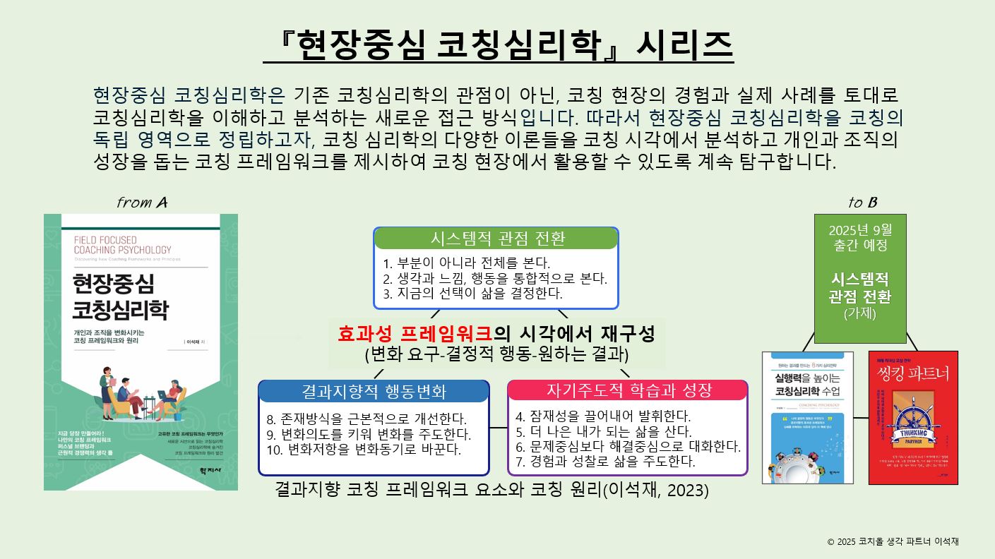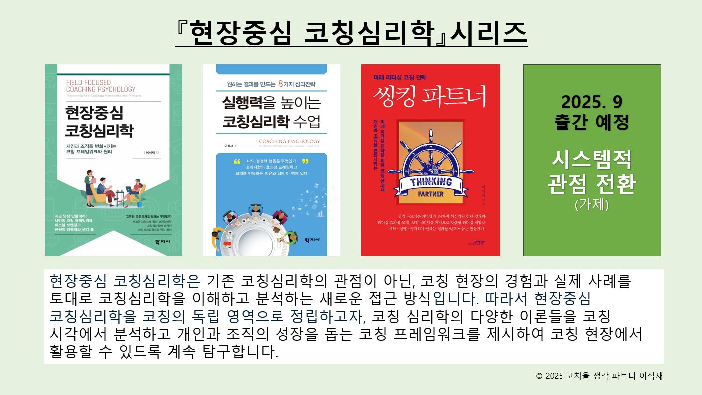 3. 여력이 되면 현장중심 코칭심리학 시리즈의 요체와 신규 내용을 포함해서 한 권의 <코칭학 입문> 책을 출간할 수도 있습니다.