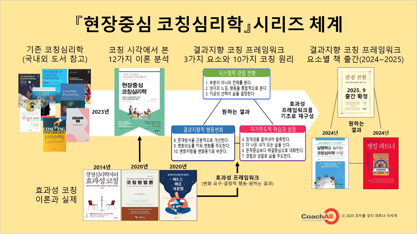 현장중심 코칭심리학은 기존 코칭심리학의 관점이 아닌, 코칭 현장의 경험과 실제 사례를 토대로 코칭심리학을 탐구하는 새로운 접근 방식입니다. 따라서 현장중심 코칭심리학을 코칭방법론에 기초한 독립 영역으로 정립하고자 코칭심리학의 이론들을 코칭 시각에서 분석했습니다. 또 개인과 조직의 성장을 돕는 결과지향 코칭 프레임워크를 제시하여 코칭 현장에서 증거기반 코칭을 실천할 수 있도록 계속 탐구합니다.