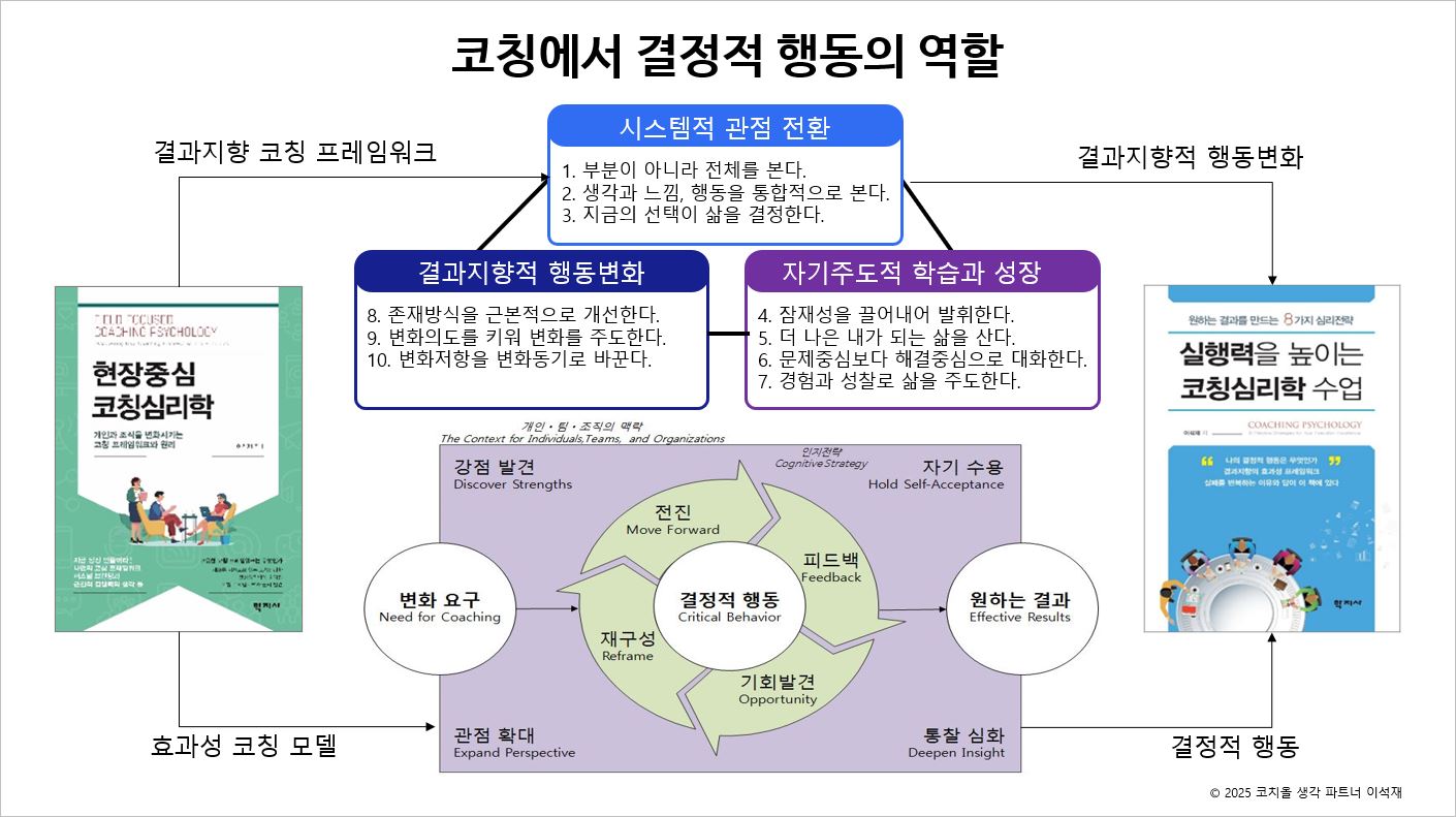 이러한 결정적 행동의 역할과 행동변화에 대한 구체적인 코칭 사례와 논리는 <실행력을 높이는 코칭심리학 수업> 책을 참고바랍니다. 실행은 전략입니다. 원하는 결과를 만드는 8가지 심리전략을 토대로 실행력 코칭을 전개했습니다.