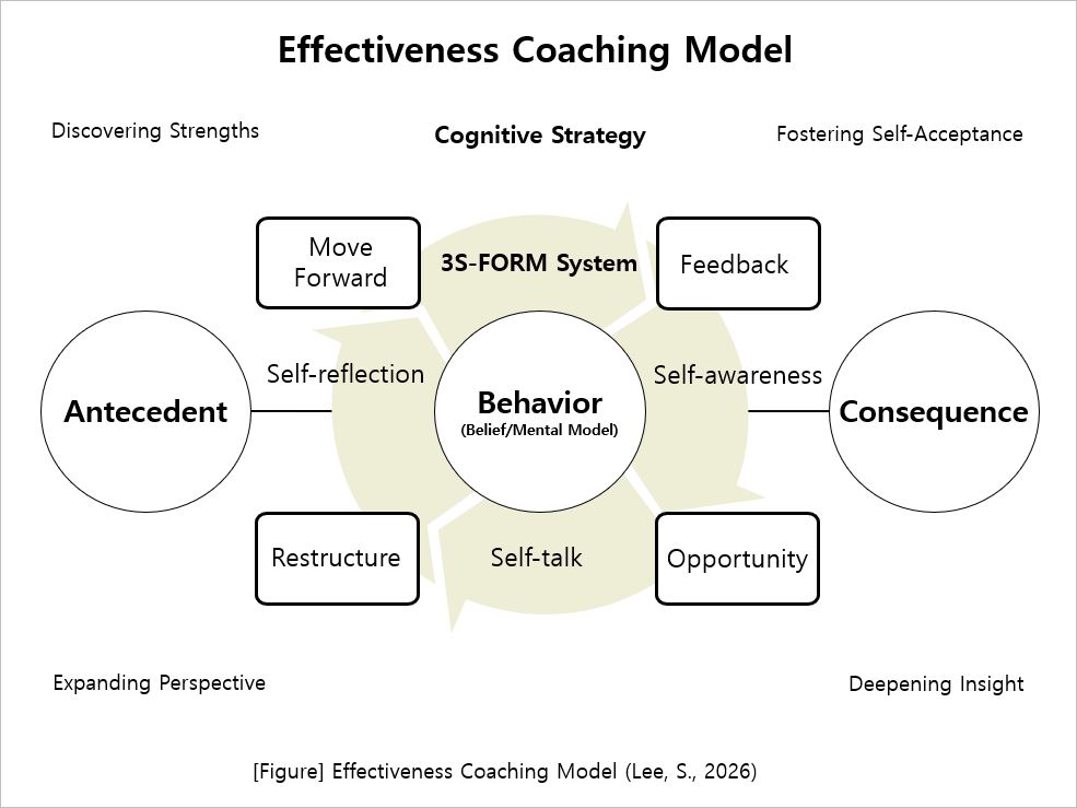 The Effectiveness coaching is based on the assumption that 'people seek effectiveness to increase the possibility of achieving their desired results in life'. Here, effectiveness refers to the degree to which an individual, team, or organization obtains the desired result. The Effectiveness coaching is a collaborative partnership that increases the possibility of obtaining the desired result by using the motivation to construct the life of the coaching target, the demand and potential for change, and self-awareness about it as an energy source for change. Coaches are experts who play the role of partners who stimulate thoughts and help them achieve desired results(called "effective results") in these cooperative activities(Lee, 2014; 2023).