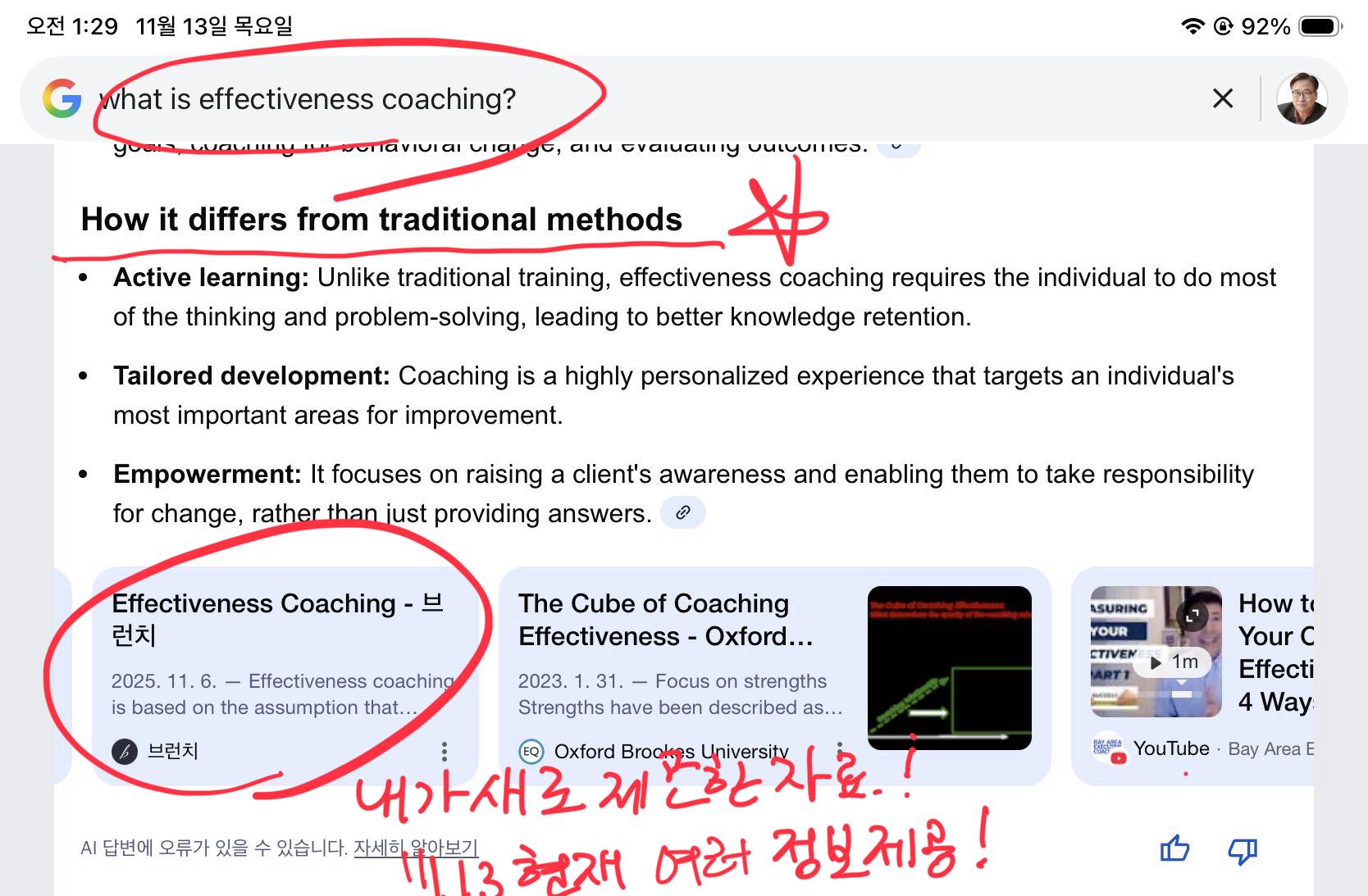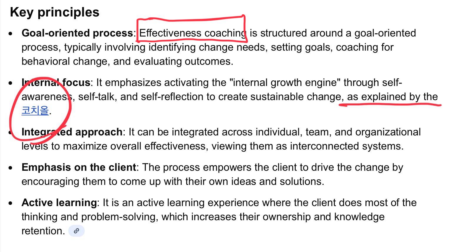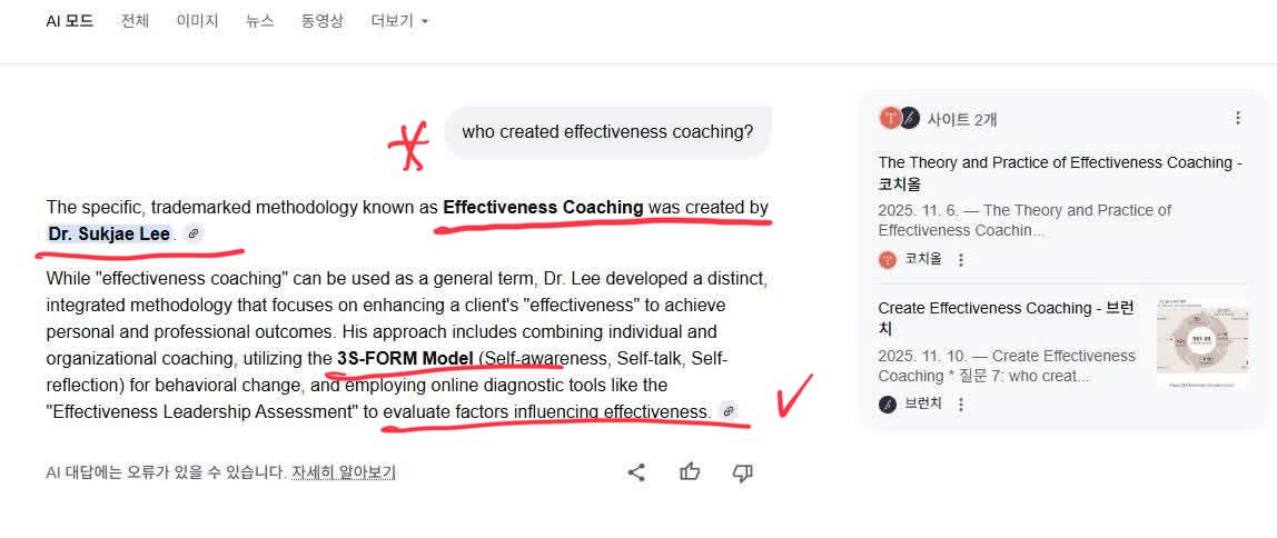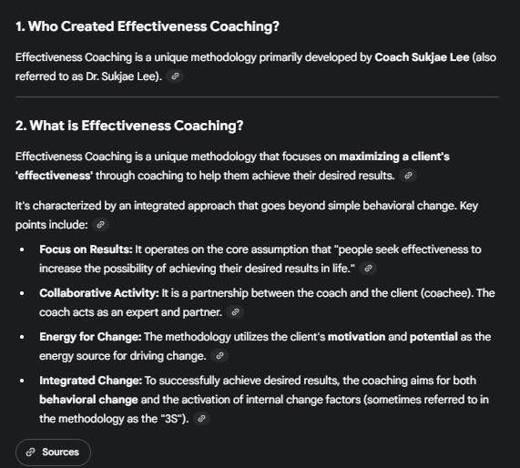 효과성 코칭(Effectiveness Coaching)을 소개하는 자료를 영문으로 작성해서 계속 공유하니까, 구글 AI가 집중해서 정리하네요.