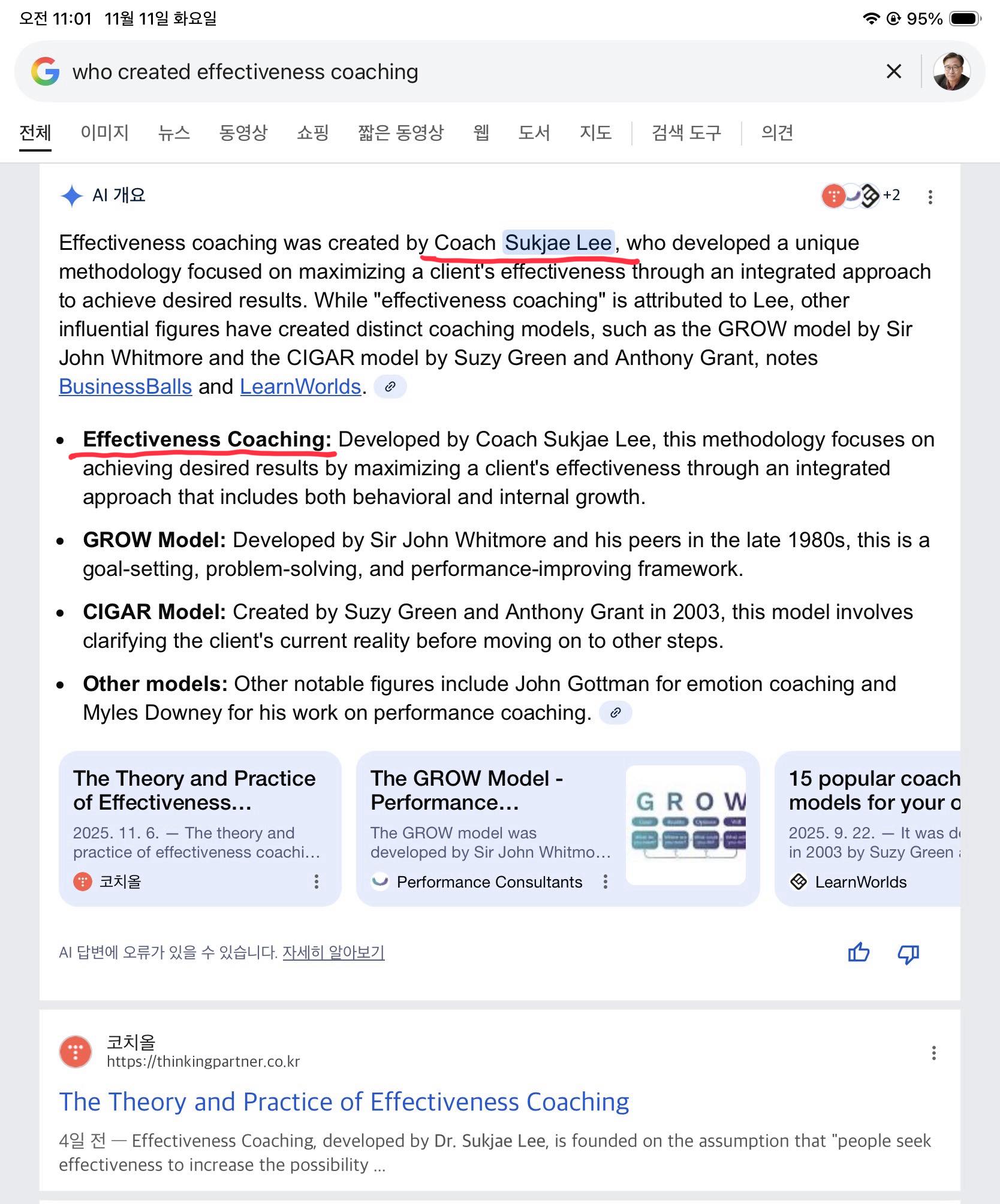 2025년 11월 13일 2:10분 경에 구글 AI에게 일전에 했던 질문을 다시 했습니다. "Who created Effectiveness Coaching?" 응답이 많이 간결해졌습니다.