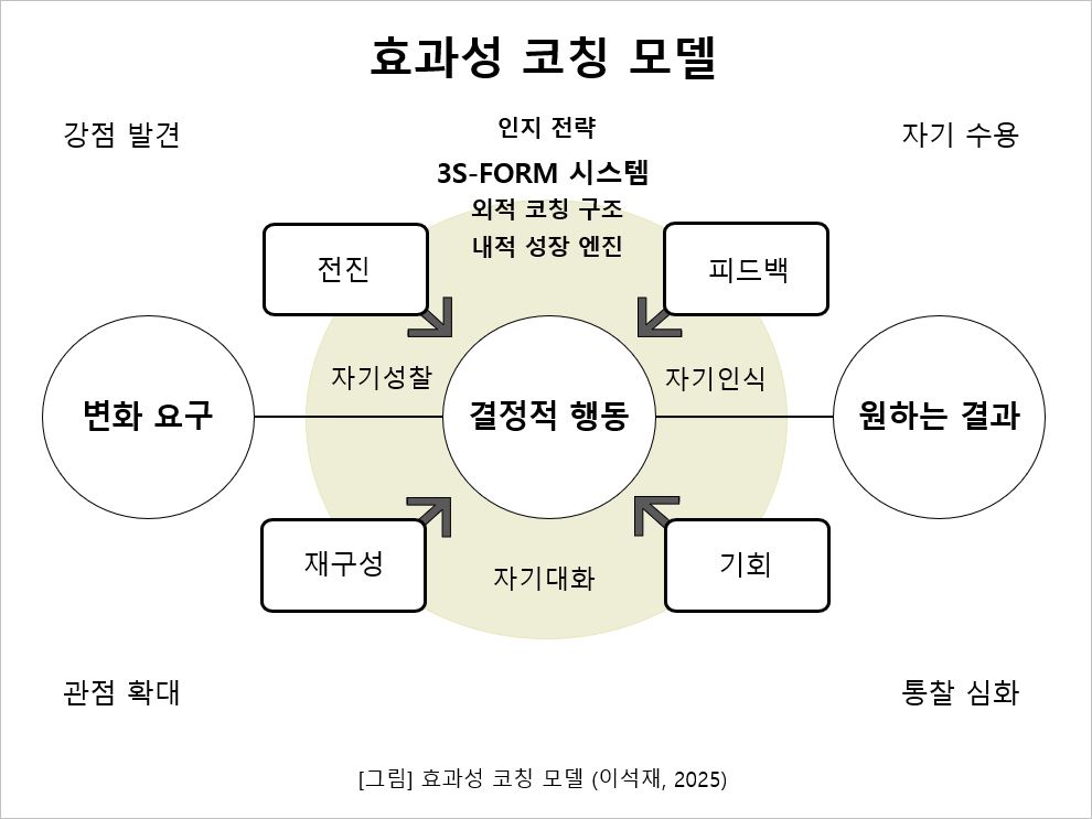 ‘코칭 효과성(코치가 얼마나 잘 코칭하는가)’이라는 일반적 개념과 Dr. Lee Suk-Jae가 개발한 고유한 효과성 코칭 방법론(Effectiveness Coaching Methodolog)을 명확히 구분하는 것이 중요하다. 이 방법론은 원하는 결과를 얻을 가능성을 높이기 위해 설계된 체계적이고 증거 기반의 시스템이다(Lee, 2014; 2020; 2024). 내적 성장 엔진(Inner Growth Engine)은 자기인식, 자기 대화, 성찰을 의미 있는 통찰로 전환시키는 핵심 메커니즘이다. 이 엔진은 개인이 경험을 재해석하고, 행동을 조정하며, 더 효과적인 결과를 향해 나아가도록 돕는다.