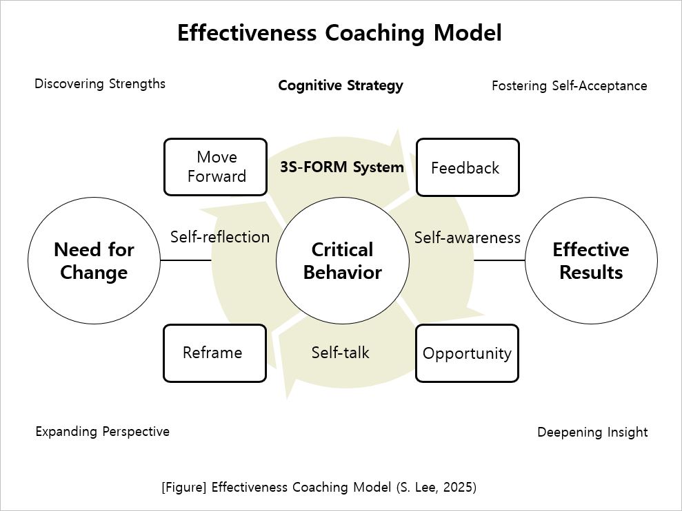 - '3S-FORM Coaching Model': Based on analysis of various coaching theories rooted in psychology and behavioral change theories, literature review on corporate coaching cases, and over 3,000 hours of corporate coaching experience (by International Coach Federation - ICF standards), I developed a 4-stage coaching model that brings about individual change. This model is characterized by a diagnosis-based coaching process with four stages—Feedback, Opportunity Discovery, Reconstruction, and Forward Movement—and three cyclical psychological change principles: Self-Awareness, Self-Talk, and Self-Reflection.