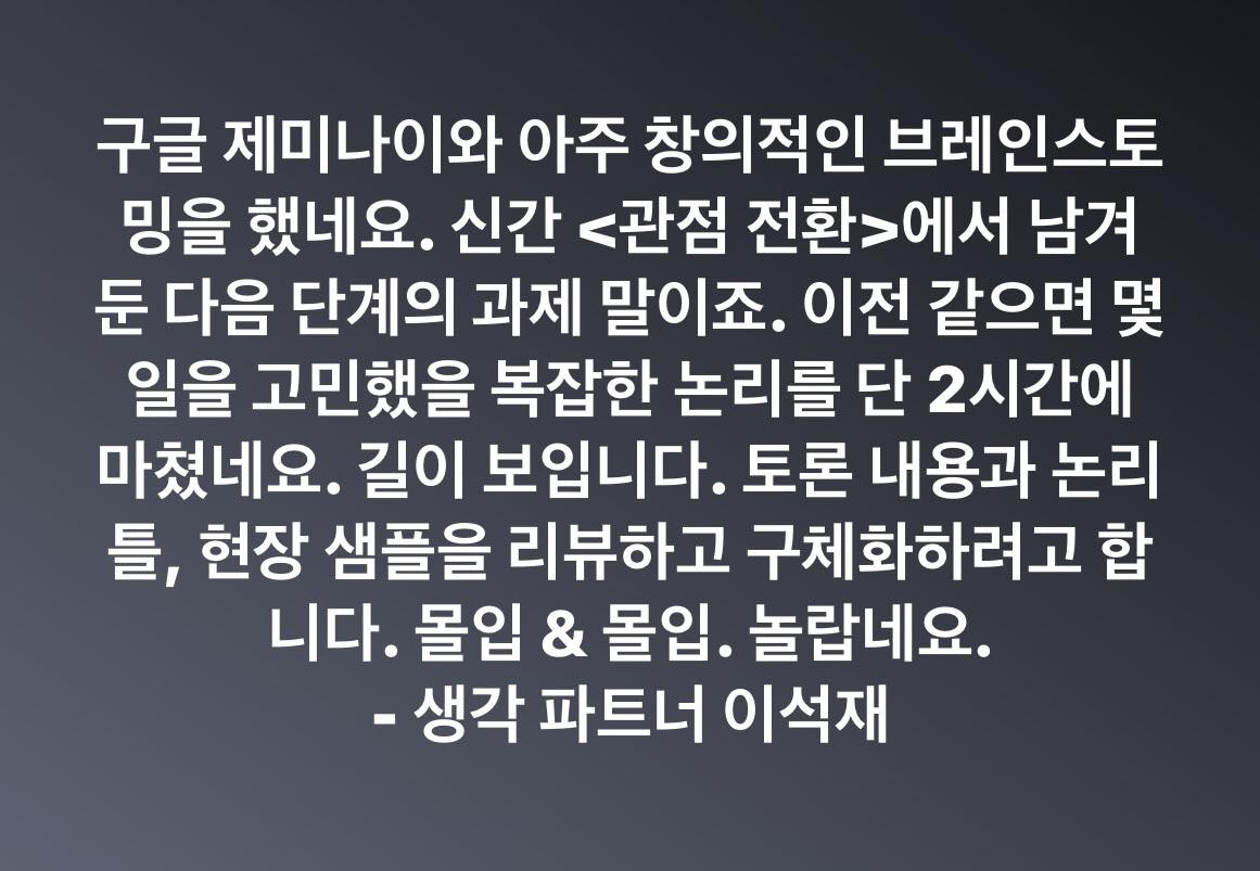 왠지 제미나이와 영어로 대화를 해야한다고 생각했죠. 그동안 출간한 책 중에서 제미나이가 내 생각을 이해하는데 도움되는 6권의 책을 골라서 핵심을 알려주었죠. 그리고 다양한 질문을 통해 앞으로 대화할 맥락과 사용하는 개념의 정의와 의미를 조율했습니다. 이제 내가 풀고 싶은 과제를 딥러링 차원에서 풀어봅니다. 여러 모델과 개념을 연결하고 통합했죠. 과제에 대한 답을 얻는 길이 보이네요.