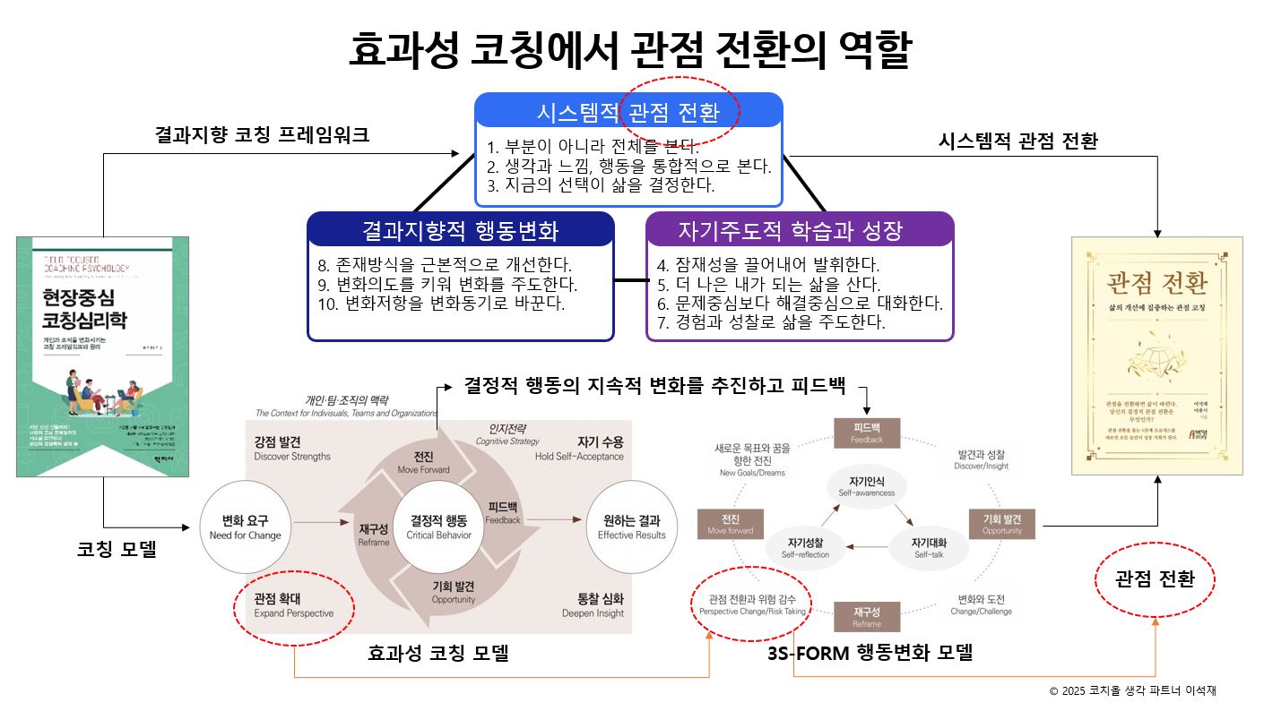 In the Effectiveness Coaching Model (Lee, 2023), "perspective expansion" is a key cognitive strategy for fostering change in coaching clients' thoughts and behaviors. It's also one of the three elements that make up the results-oriented coaching framework. For specific coaching examples and the rationale behind this role, please refer to the new book, "Perspective Shift." (Lee & Lee, 2025). Dr. Lee (Thiniking Partner) has developed "Perspective Coaching," a coaching methodology for shifting perspectives.