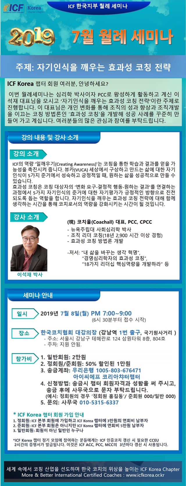 ICF 7월 월례 세미나: 자기인식을 깨우는 효과성 코칭 전략 본문
