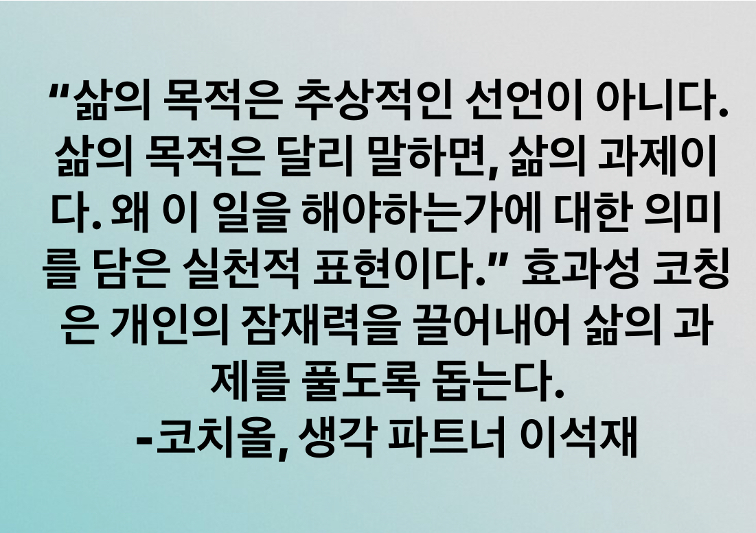 코칭을 준비하다가, 기본을 챙겨야겠다고 생각했다. 기본이란, 코칭의 정의이다. “효과성 코칭은 주어진 맥락에서 코칭 대상자가 자신의 ‘변화요구-결정적 행동-원하는 결과’를 연결하는 새로운 생각의 판을 짜도록 돕는 목표지향적인 협력활동이다.”