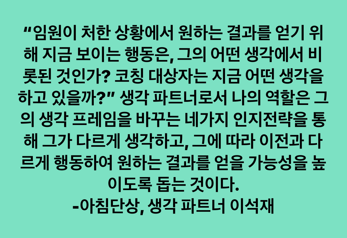 코칭을 준비하다가, 기본을 챙겨야겠다고 생각했다. 기본이란, 코칭의 정의이다. “효과성 코칭은 주어진 맥락에서 코칭 대상자가 자신의 ‘변화요구-결정적 행동-원하는 결과’를 연결하는 새로운 생각의 판을 짜도록 돕는 목표지향적인 협력활동이다.”