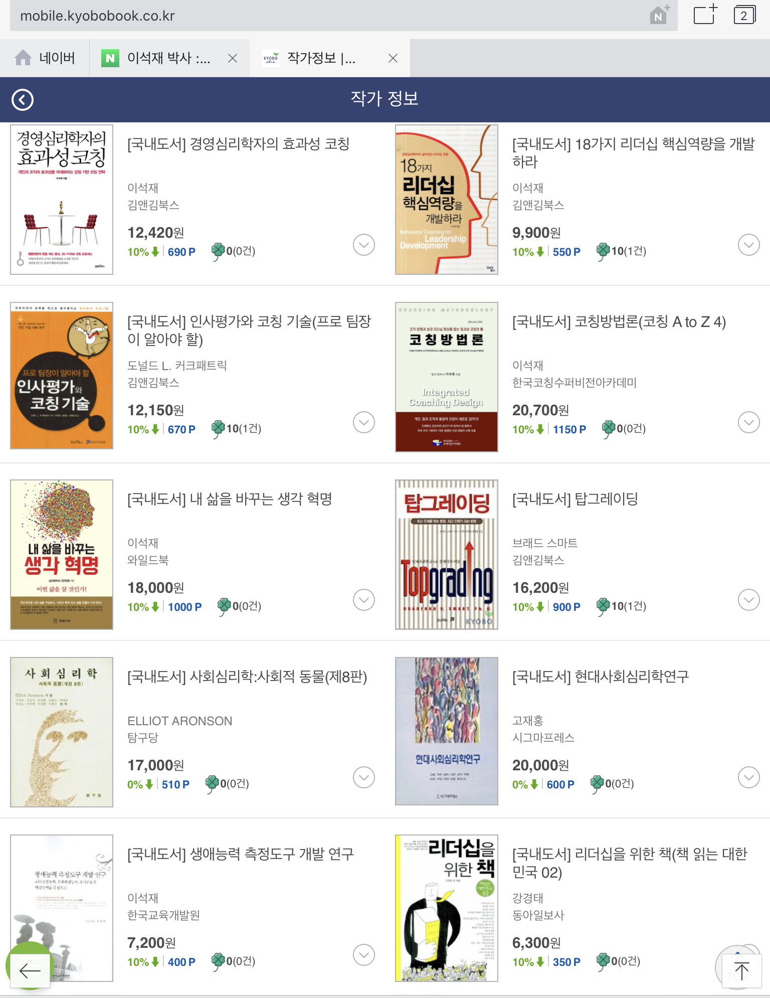 교보문고 인터넷점에서 작가 정보 이석재를 검색하거나 신간 [코칭방법론]을 검색한 후, 저자 소개(이석재)-'작가 자세히 알기' 창을 열면 그동안 저술과 번역(공역), 연구보고서(대학원생들이 많이 찾는 도서) 등을 한 눈에 볼 수 있다. 정리 감사해요~