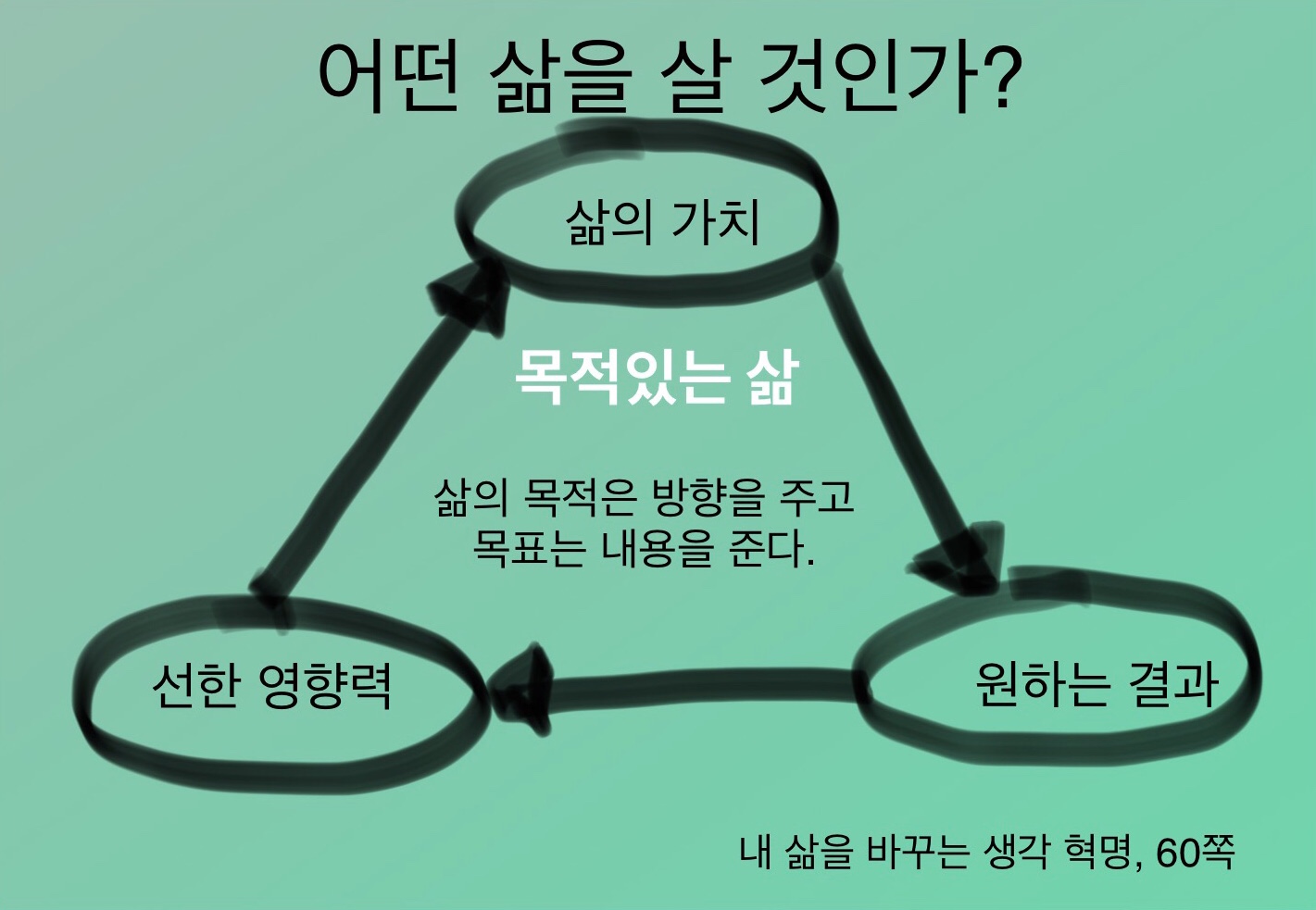 오늘 독서의 요점은 삶에서 의미를 찾고 삶의 목적을 명확히 설정하라! 목적있는 삶을 자발적으로 선택하고 실행할 때, 실질적인 행동 변화가 나타난다. ‘내 삶을 바꾸는 생각 혁명’(이석재, 2019)의 요점과 일치한다. 중요한 것은 자신의 생각을 얼마나 끌고 갈 수 있느냐는 것.
