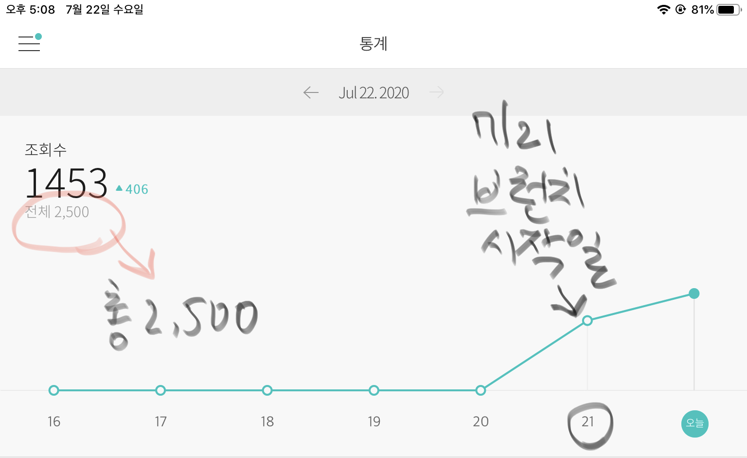 7/21일 브런치를 시작하고 공개한 글을 조회한 전체 수가 7/22 오후 5시 현재 2,500이네요. 오늘 자정이 되면 3,000을 넘을 것으로 예상합니다. 이 자료를 보면서 앞으로 글 쓰기에 대해 힌트를 얻었습니다. 시사점이 있네요.