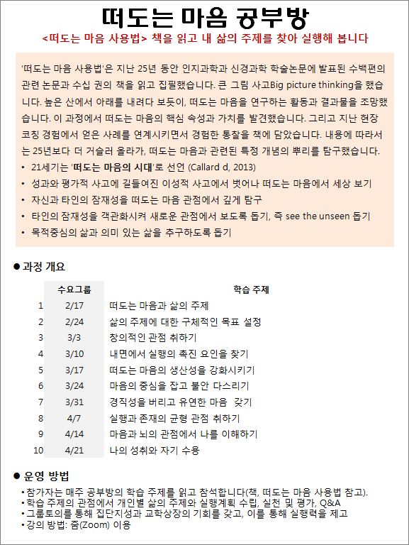주교재는 책 <떠도는 마음 사용법>입니다. 2021년 새로운 관점에서 여러분의 귀한 삶을 디자인해 보십시오. Zoom으로 진행합니다.