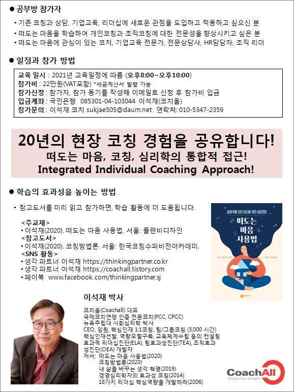 | 코칭심리학 공부방 운영 안내 (0) | 2021.02.18 |