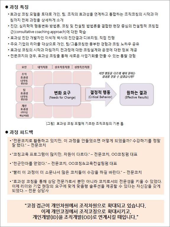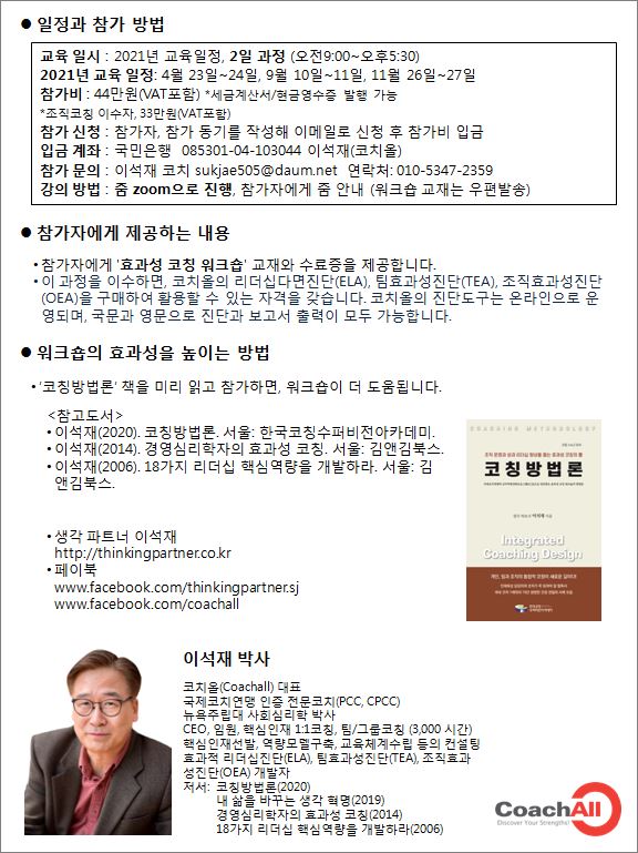| 코칭방법론 책과 효과성코칭워크숍(조직코칭) 6월 과정 소개 (0) | 2020.04.03 |