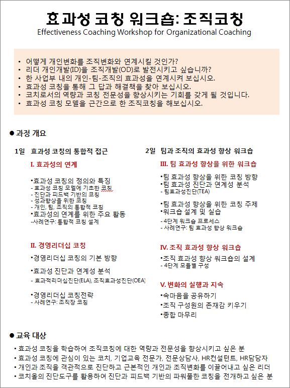지난 2015년부터 진행한 '효과성 코칭 워크숍: 조직코칭'을 온라인으로 진행합니다. 조직코칭은 '효과성 코칭모델'과 리더십진단도구(ELA), 팀효과성진단(TEA), 조직효과성진단(OEA)를 활용한 진단기반의 접근을 사용합니다. 진단을 활용한 '효과성 기상도 분석'을 통해 개인-팀-조직의 효과성을 연계시키고, 개인개발(ID)을 조직개발(OD)로 확장하도록 합니다. 오프라인으로 진행하는 것을 고집하다가, 줌zoom으로 진행하기로 결정했습니다. 2021년 워크숍 일정에 따라서 진행합니다. 첨부한 안내문을 참고바랍니다.
