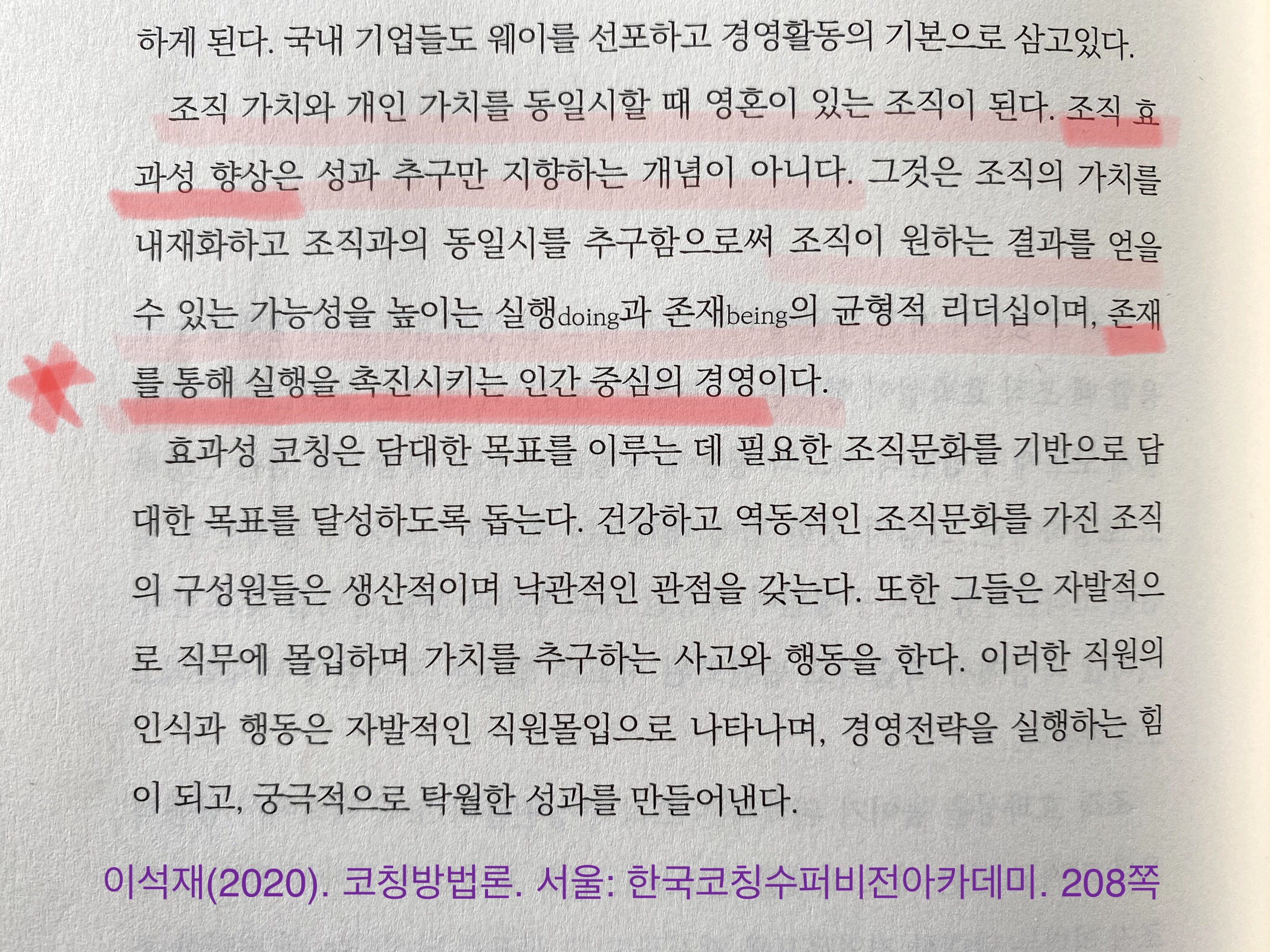 “조직 효과성 향상은 조직이 원하는 결과를 얻을 수 있는 가능성을 높이는 실행doing과 존재being의 균형적 리더십이며, 존재를 통해 실행을 촉진시키는 인간 중심 경영이다.” (208쪽)