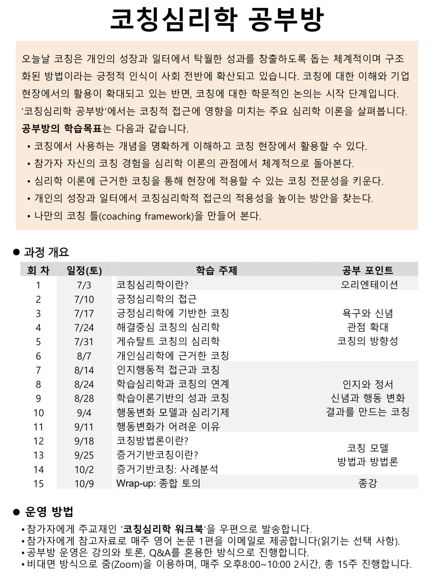 '코칭심리학 공부방' 2기를 공개과정으로 운영합니다.