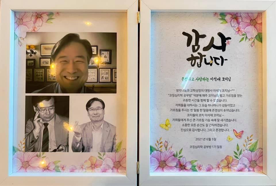 어제는 15주 ‘코칭심리학 공부방’ 종강을 기념했죠. 참가자 중의 한 분이 1기의 마음을 담았다며 멋진 액자와 꽃다발을 선물로 주셨습니다. 처음 받아보는 선물이죠. 섬세한 마음 씀씀이에 깊은 감동을 받았습니다. 안상윤 교수님, "감사합니다. 사진도 참 잘 선정하셨어요." 바쁜 중에도 모임에 참가해 주신 분들에게 감사드립니다. 또 1기 모든 분들에게도 감사합니다. 생각나눔과 교학상장한 잊지 못할 추억입니다.