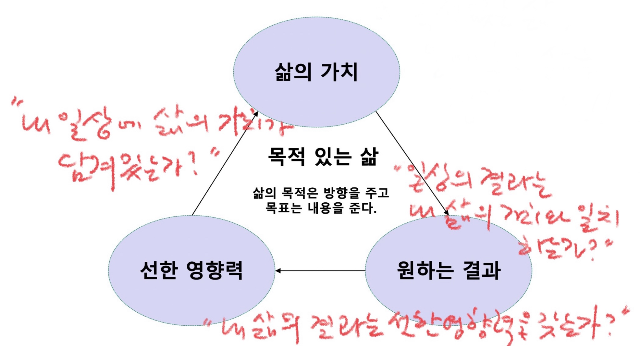 어떻게 목적 중심의 삶을 구성할 것인가? 목적 있는 삶은 핵심적인 세 가지 구성 요소가 순환적인 관계를 갖는다. 즉 삶의 가치, 원하는 결과, 선한 영향력이 서로 연계성을 갖는다. 목적 있는 삶이 성공적으로 이루도록 다음 세 가지 질문을 반복적으로 하고, 그에 대한 답이 연계되도록 한다.