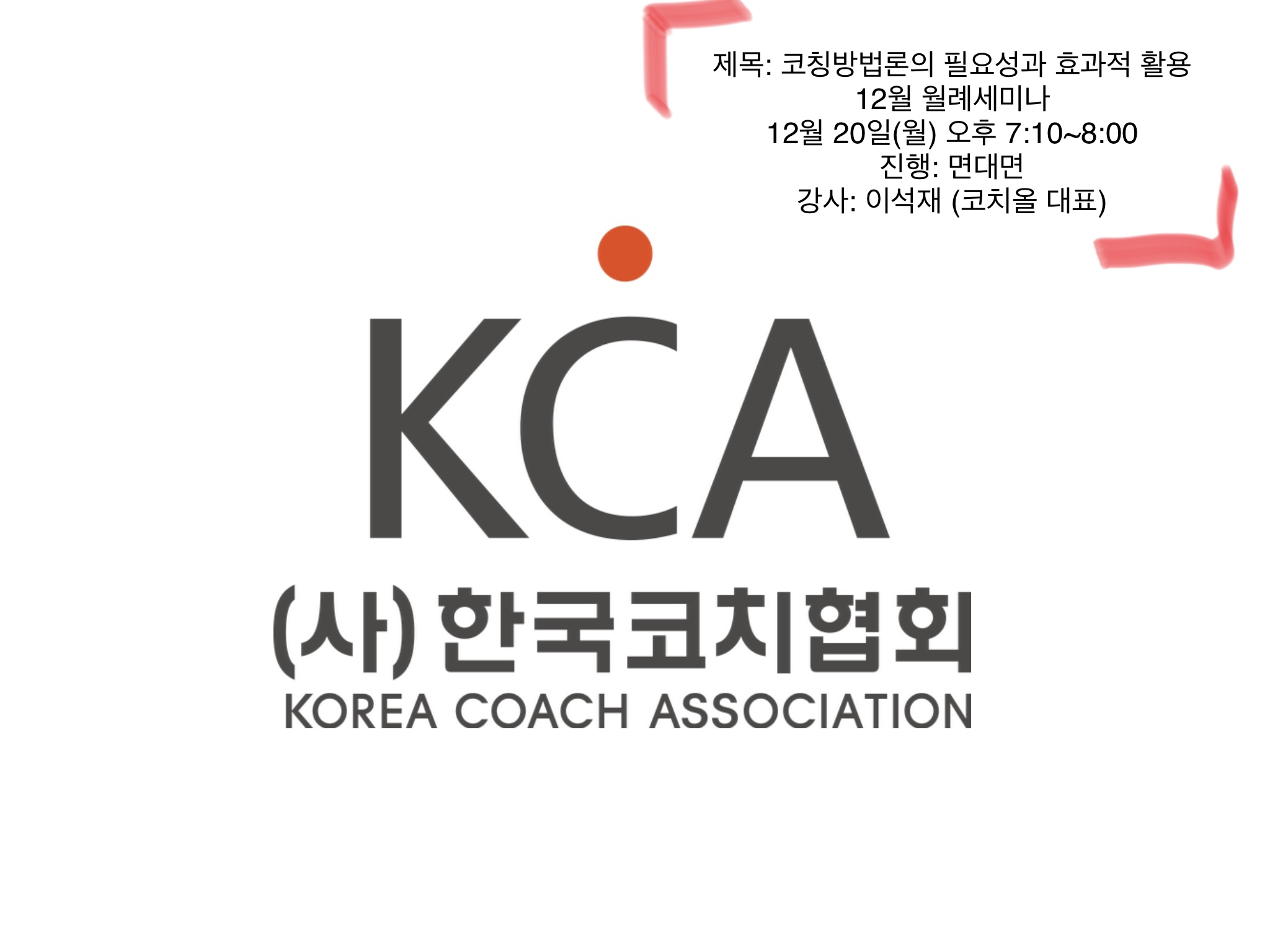 코치라면 기본적으로 알고 있어야 할 코칭방법론, 이 주제에 관심있으신 분들의 참가를 환영합니다. 당일 송년회도 예정되어 있어서 공식적인 상세 안내는 한국코치협회가 공지할 예정입니다.