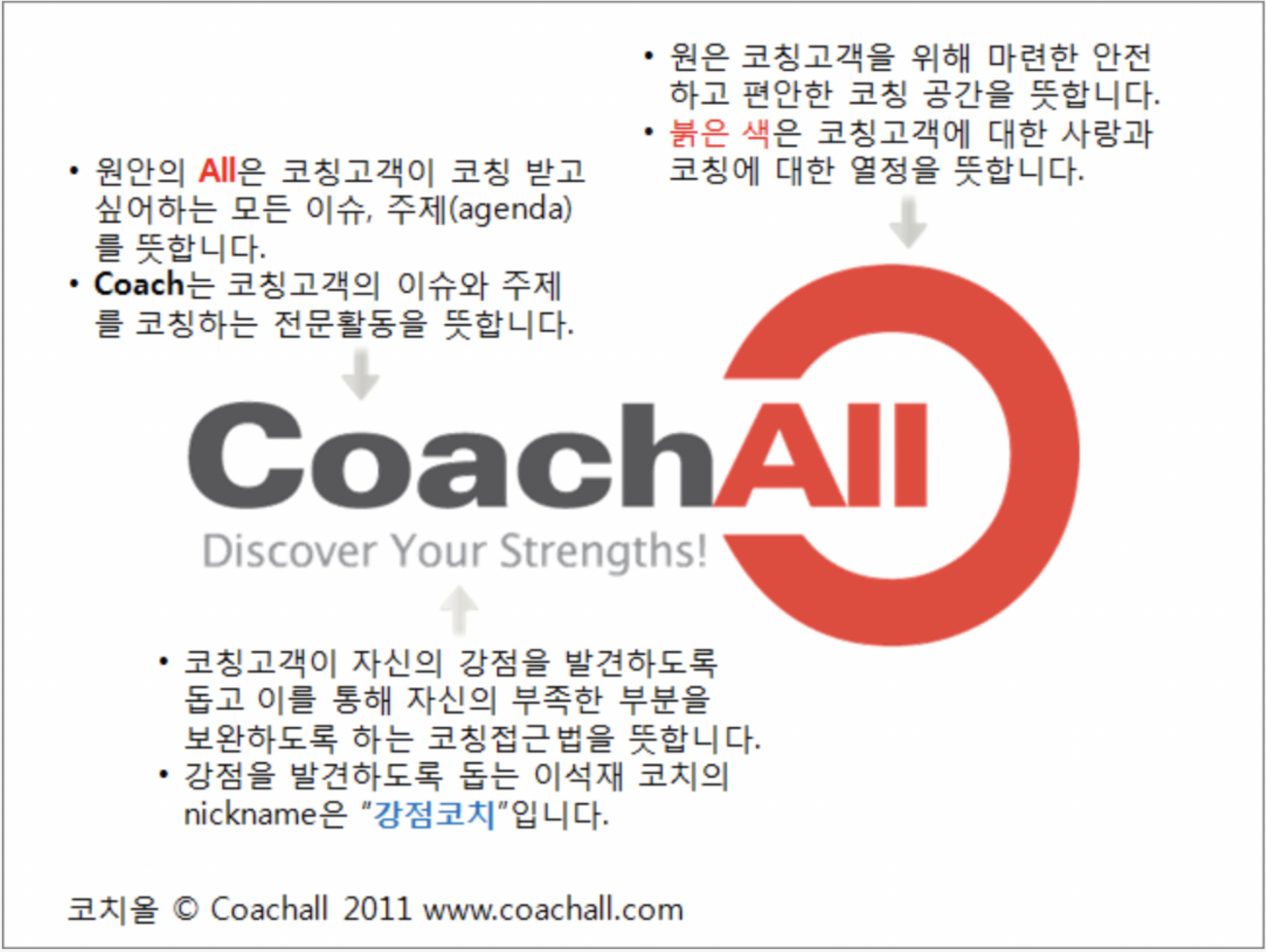 지난 2002년 코칭을 시작한 후 2010년 11월 1일 코치올(Coachall, www.coachall.com)을 세우고 이제 만으로 11년이 지나네요. 2011년 초 홈페이지를 만들고 CI를 소개했던 자료를 보니 마음이 찡합니다. 당시 닉네임이 강점코치, 지금은 코치의 미래 역할을 반영한 생각 파트너입니다. 그간 코치올에 깊은 관심과 사랑, 응원을 보내주신 모든 분들에게 감사를 전합니다. 덕분에 효과성 코칭과 방법론을 만들고 효과적 리더십진단(ELA), 팀효과성진단(TEA), 조직효과성진단(OEA)을 통해 개인과 팀, 조직의 효과성을 연계하는 통합적 코칭을 전개해 볼 수 있었습니다.