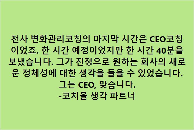 오늘 CEO코칭과 임원코칭에서 어떤 대화가 오갈 것인가? CEO코칭에서는 최근 경영환경 위기를 돌파하는 전략과 Way에 대한 세부 주제를 다룰 수 있다. 임원들과는 변화관리 코칭의 내용을 리뷰하고 학습과 통찰, 성과를 축하하는 시간으로 채워질 수 있다. 그간의 생각나눔과 교학상장의 시간을 함께 나눈 것에 대해 감사인사도 나누리라.