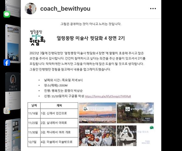 요즘 박상순 코치님이 진행하는 ‘얼렁뚱땅 미술사 뒷담화’에 참가해 아주 다양한 인사이트를 경험하고 있죠. 이 프로그램은 4개의 제목으로 구성되어 있습니다. 제목에서 시사하듯 미술사의 뒷담화를 통해 ‘관점 전환’을 느끼고 개인 삶이나 일터에서 활용하고 의미를 탐구하는 노력을 할 필요성을 자각합니다.