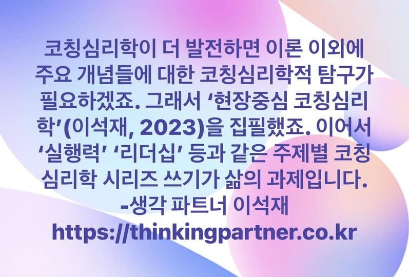 코칭심리학이 더 발전하면 이론 이외에 주요 개념들에 대한 코칭심리학적 탐구가 필요하겠죠. 그래서 첫 시작으로 ‘현장중심 코칭심리학’(이석재, 2023)을 집필했죠. 코칭시각에서 기존 코칭심리학 접근을 살폈습니다. 이어서 각론으로 들어가 봅니다.