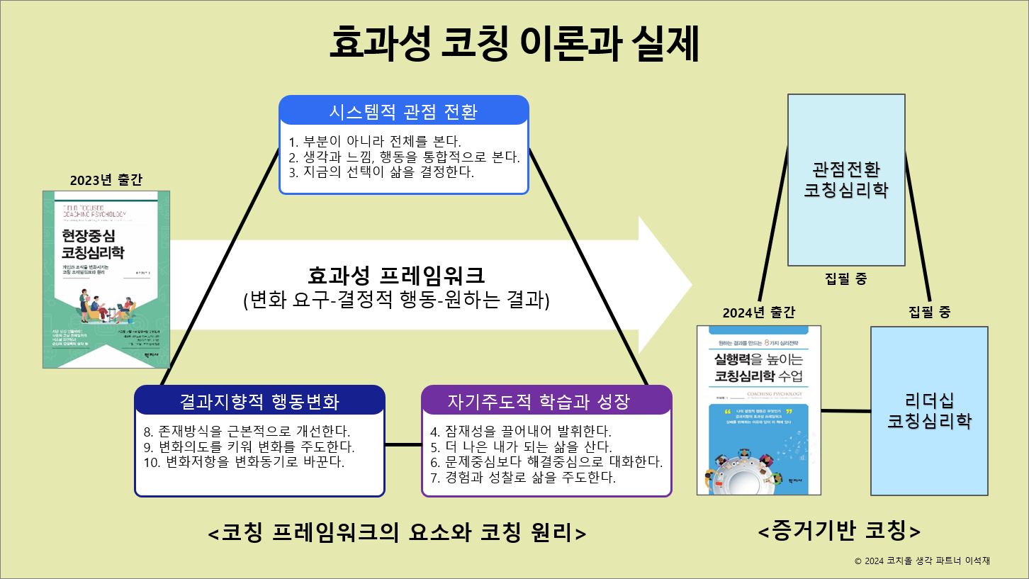 효과성 코칭 이론의 관점에서 중요한 코칭 주제(실행력, 리더십, 관점전환 등)를 탐구한 책을 시리즈로 출간합니다. 특히 경영심리학자의 효과성 코칭(2014)을 삶의 현장에서 검증하고 수정한 내용을 책에 담습니다. 3가지 코칭 프레임워크 요소에 대한 각론을 다루는 책을 쓰고 있습니다.