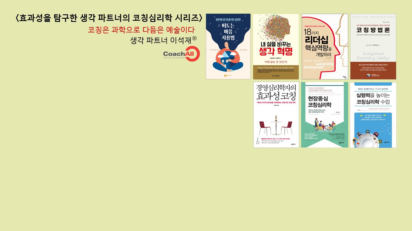 코칭에 입문한 지난 2002년부터 현재까지 22년의 코칭 경험과 지식을 담은 생각 파트너의 책에서 코칭학의 토대가 되는 출간 도서를 묶어서 <효과성을 탐구한 생각 파트너의 코칭심리학 시리즈>로 이름 붙였습니다.