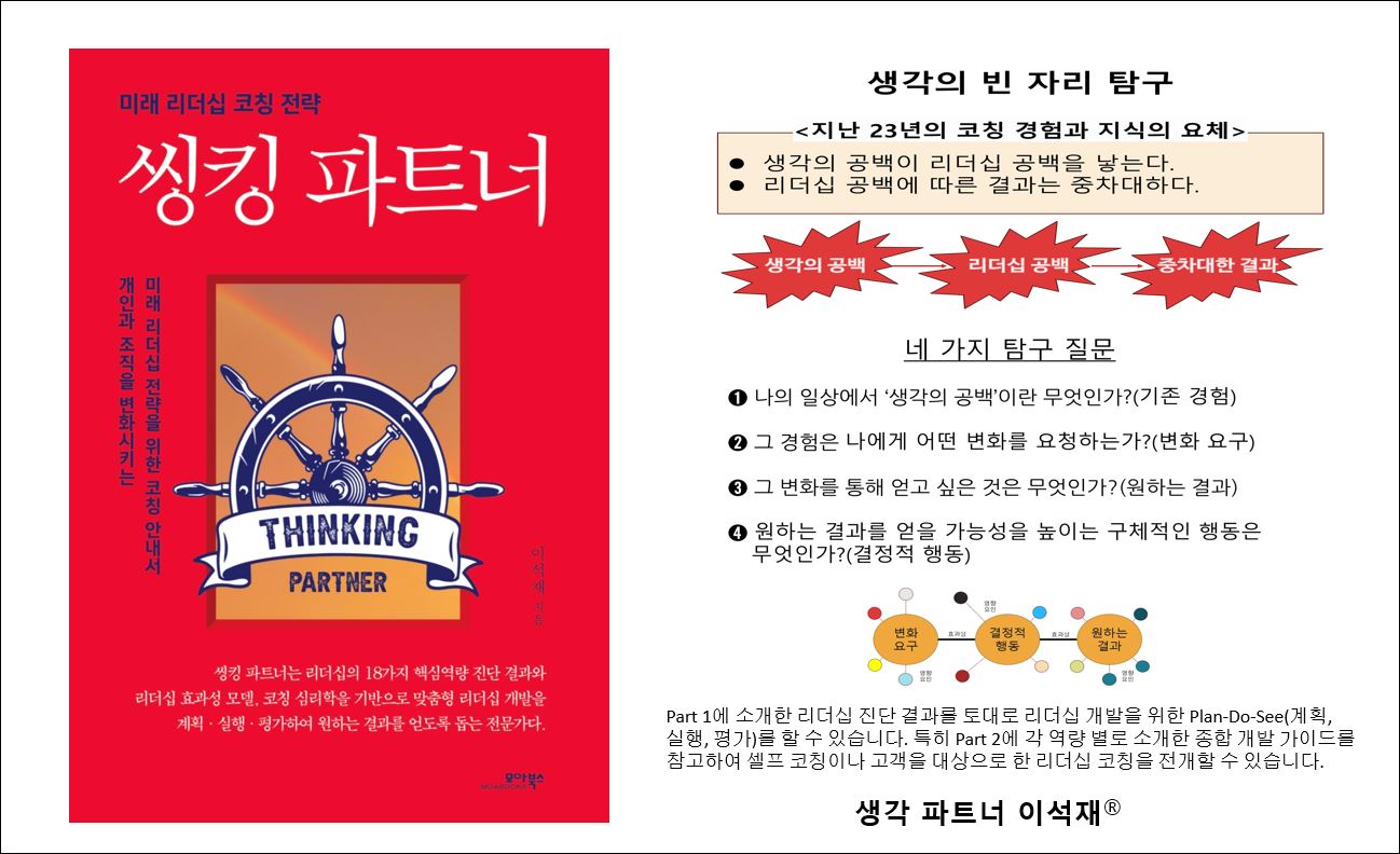 2. 그동안 리더십 진단도구가 없어서 리더십 코칭을 진행하기 어려웠던 경험을 한 경우, <씽킹 파트너> 책이 새로운 사업 기회를 만들고 키우는데 도움 되길 바랍니다.