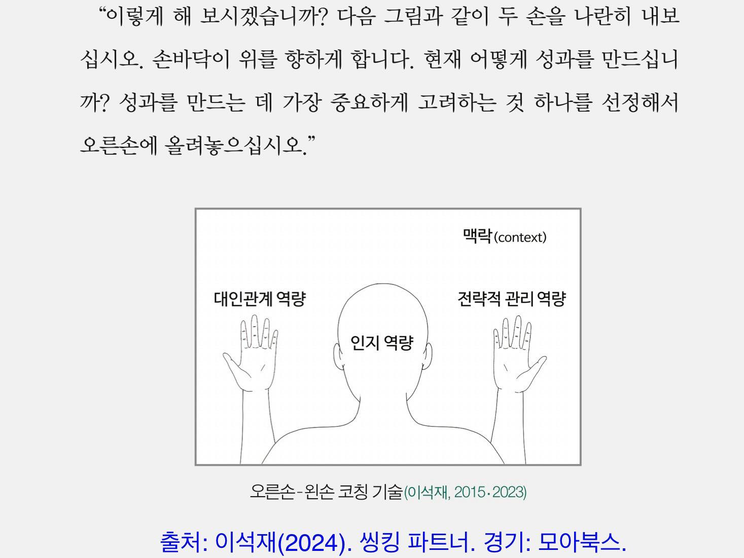 1. 생각 파트너의 일반적인 접근은 코칭 고객이 처한 맥락을 토대로 오른손-왼손 코칭 기술을 사용하죠. 이를 통해 코칭 고객(이하 고객)이 스스로 자신의 삶을 실행(doing)측면에서 살펴보도록 합니다. 이때 고객은 시선을 밖에 두고 있죠. 고객의 전두엽(뇌)이 활성 된 상태이며 평소 습관적인 문제해결 방식에 의존한 현실인식을 합니다.