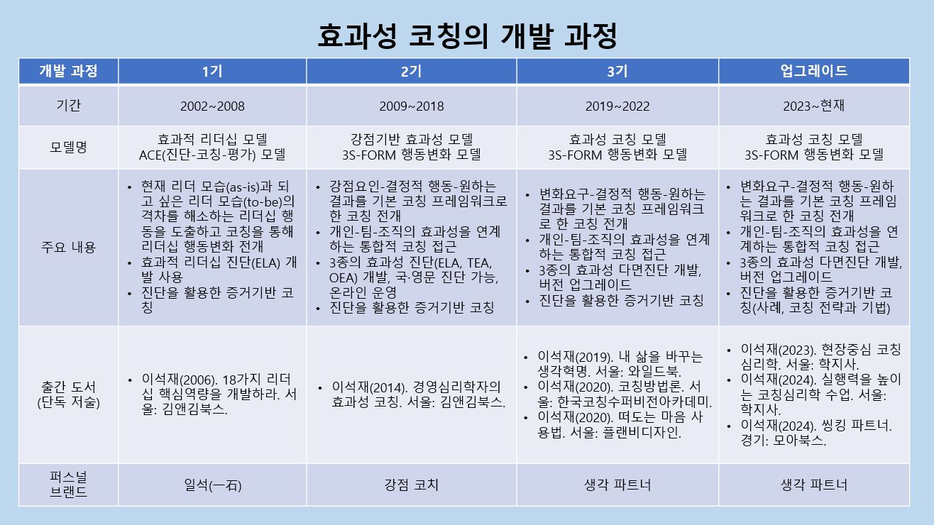 지난 2014년 효과성 코칭의 공개 이후 효과성 모델을 토대로 3종의 효과성 진단도구(리더십 ELA, 팀 TEA, 조직 OEA)를 활용하여 증거기반 코칭을 전개했습니다. 최근 23년의 코칭 경험과 학습한 지식, 주요 코칭 결과를 4권의 책에 반영했습니다.