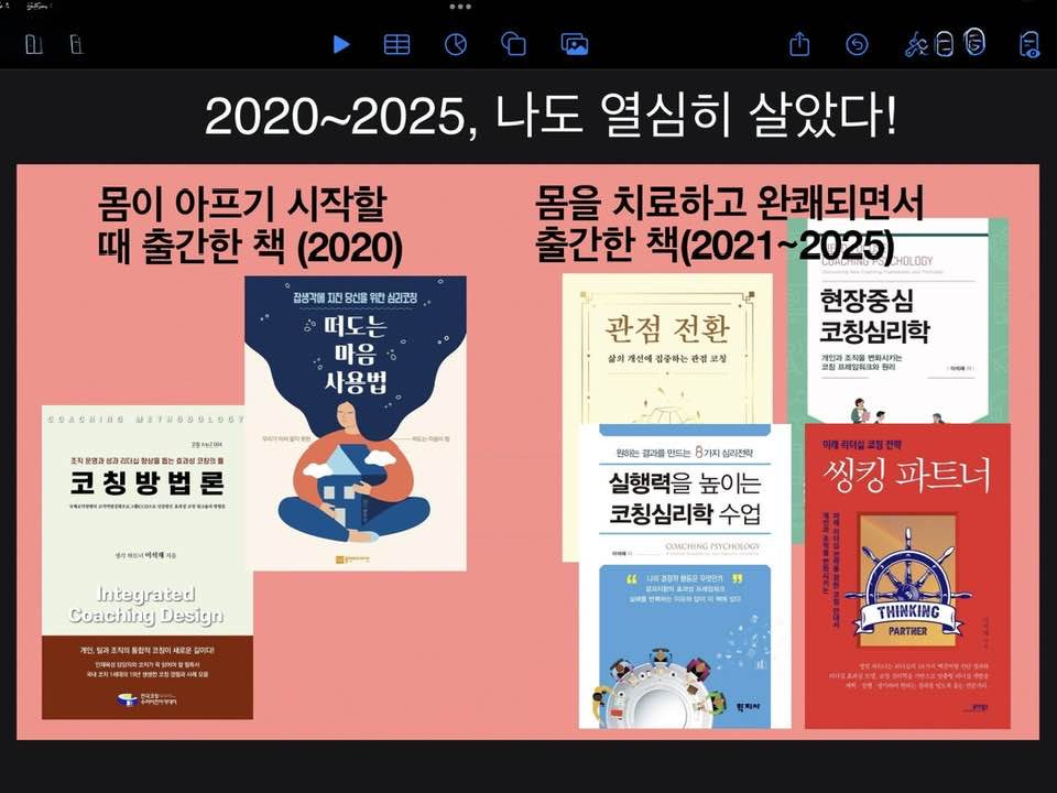 돌이켜 보면 지난 5년 동안, 나도 열심히 살았다. 내 삶이 더 이상 지속하지 못할 수도 있다는 불안과 두려움에 집필하고 싶은 책들을 서둘러 출간했다. 일종의 집착이고 강박이었다. 이제 모든 과제를 해결했으니 내게 쉼을 주자~! 이제 마음이 평안하다. 감사한 일이다. 모두 내게 주는 선물이다.