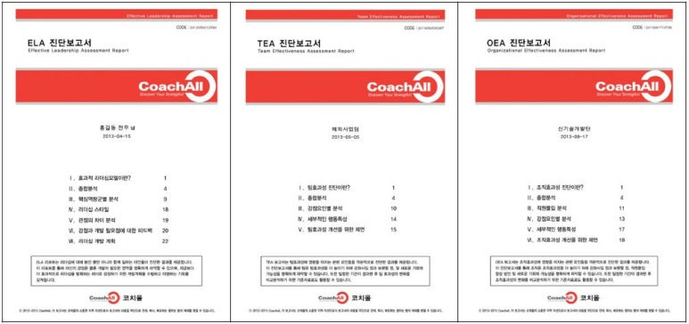 Effectiveness coaching uses online diagnostic tools to assess and interlink the effectiveness of each organizational unit. Individual effectiveness is objectively assessed through a multi-rater diagnosis using the 'Effectiveness Leadership Assessment,' teams use the 'Team Effectiveness Assessment,' and organizations use the 'Organizational Effectiveness Assessment' (both Korean and English diagnoses and reports are available).
