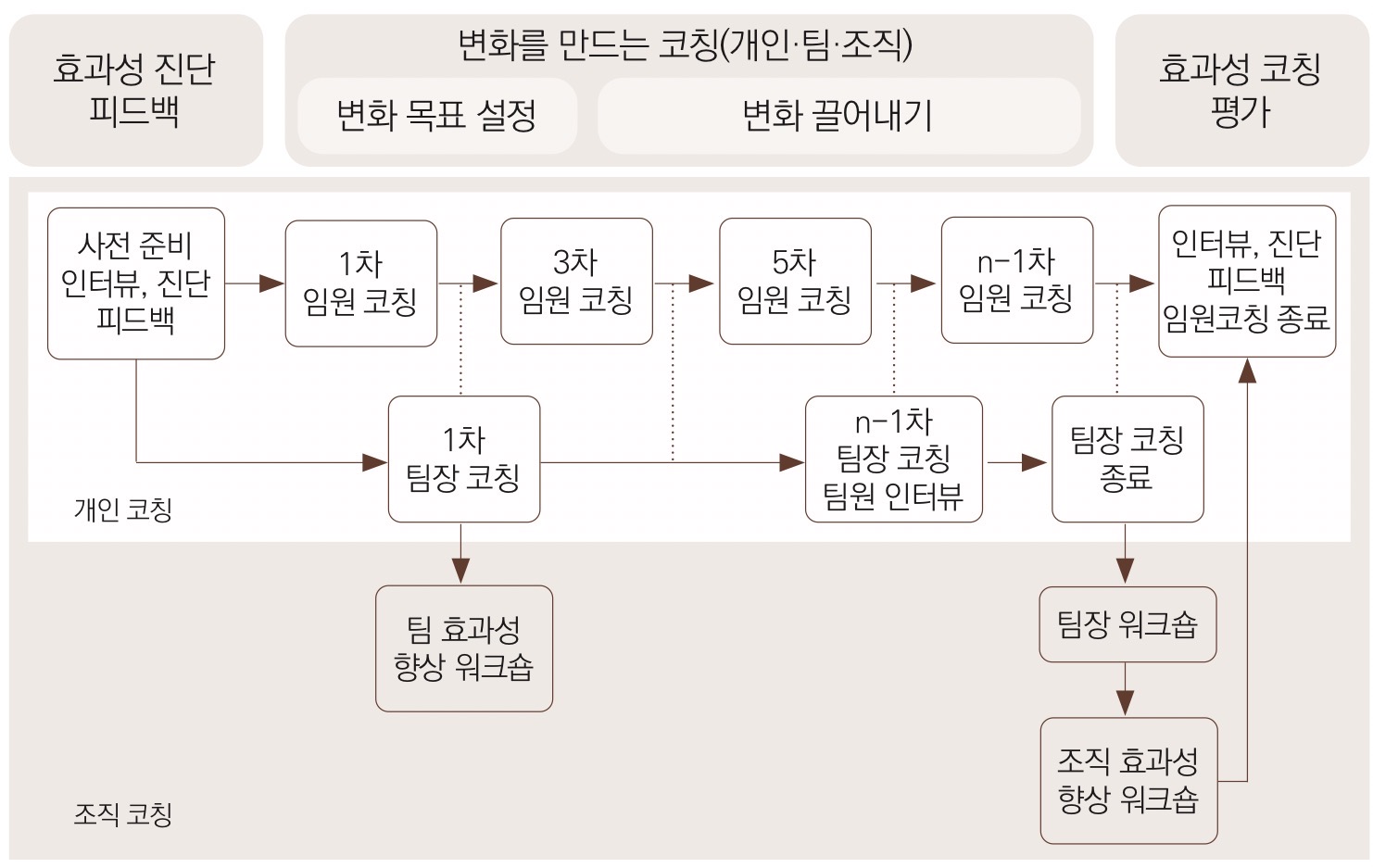 To maximize organizational effectiveness, it is necessary to objectively measure and diagnose the factors that influence individual, team, and organizational effectiveness, and to develop specific measures for these factors to improve effectiveness. To this end, 'individual coaching and organizational coaching are designed from an integrated perspective'.