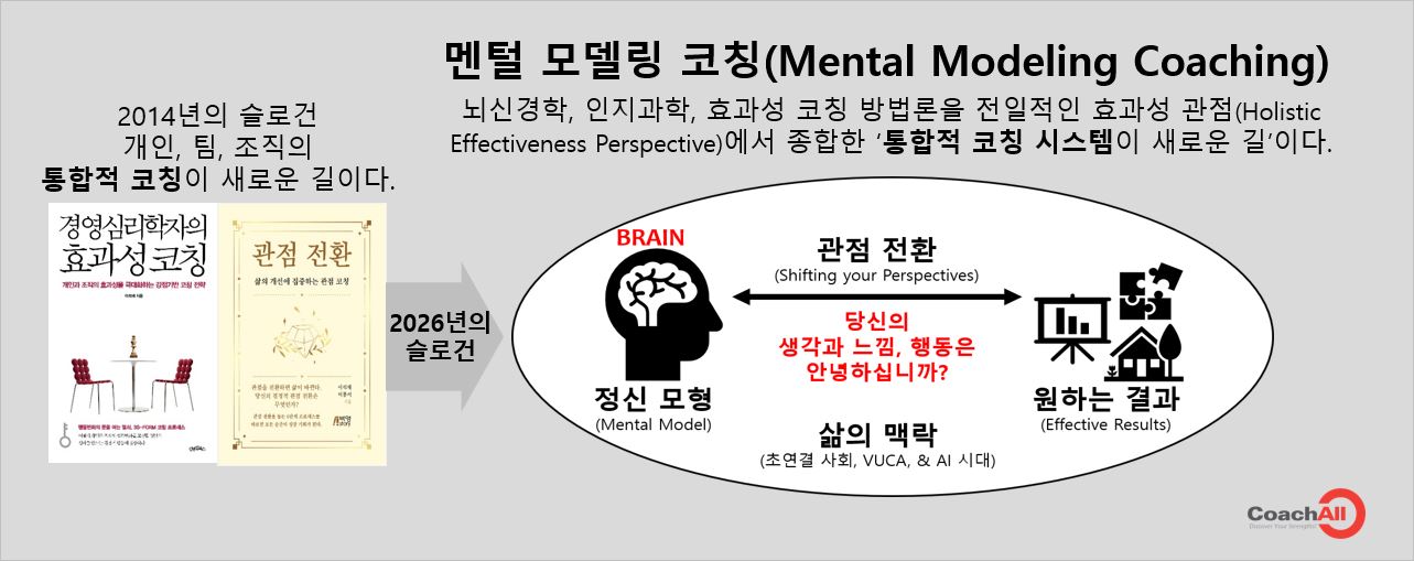 1. 오늘 (2025.12.24) 새벽 5식까지 밤을 새며 효과성 코칭 모델을 수정했네요. 뇌와 멘탈모델, 효과성 코칭 모델을 통합적으로 표현했죠. 결국 지난 2014년에 처음 효과성 코칭을 구상했을 때로 돌아갔네요. 그때는 효과성 코칭의 논리적 체계를 중요하게 생각하고 진단기반을 고집했었죠. 그래서 행동중심으로 모델을 표현했죠. 이번에 새책을 쓰면서 10 여년 전으로 돌아갔습니다.